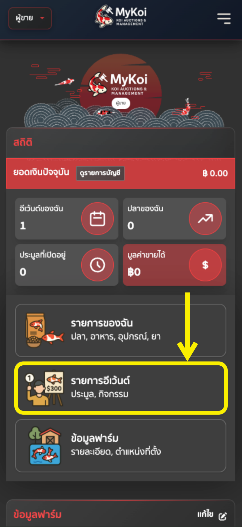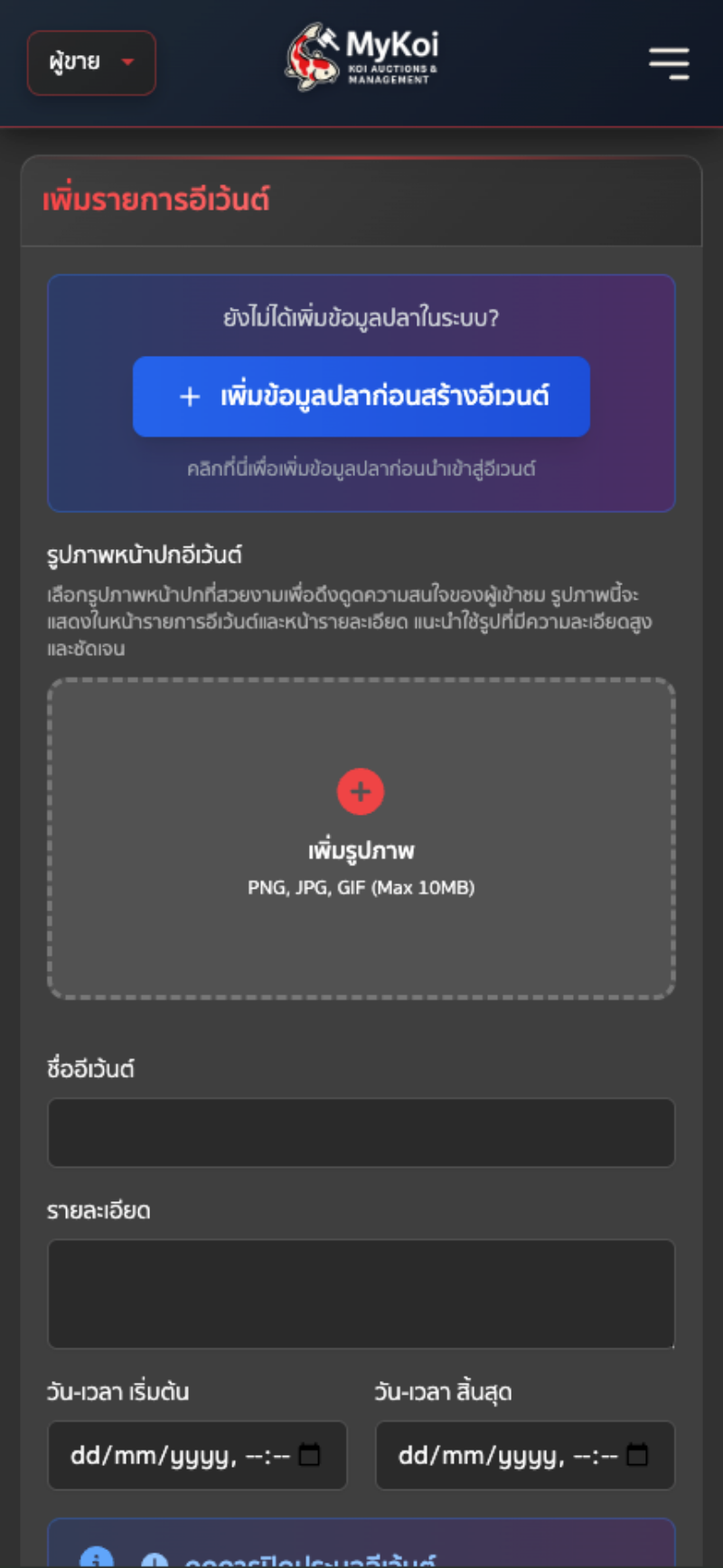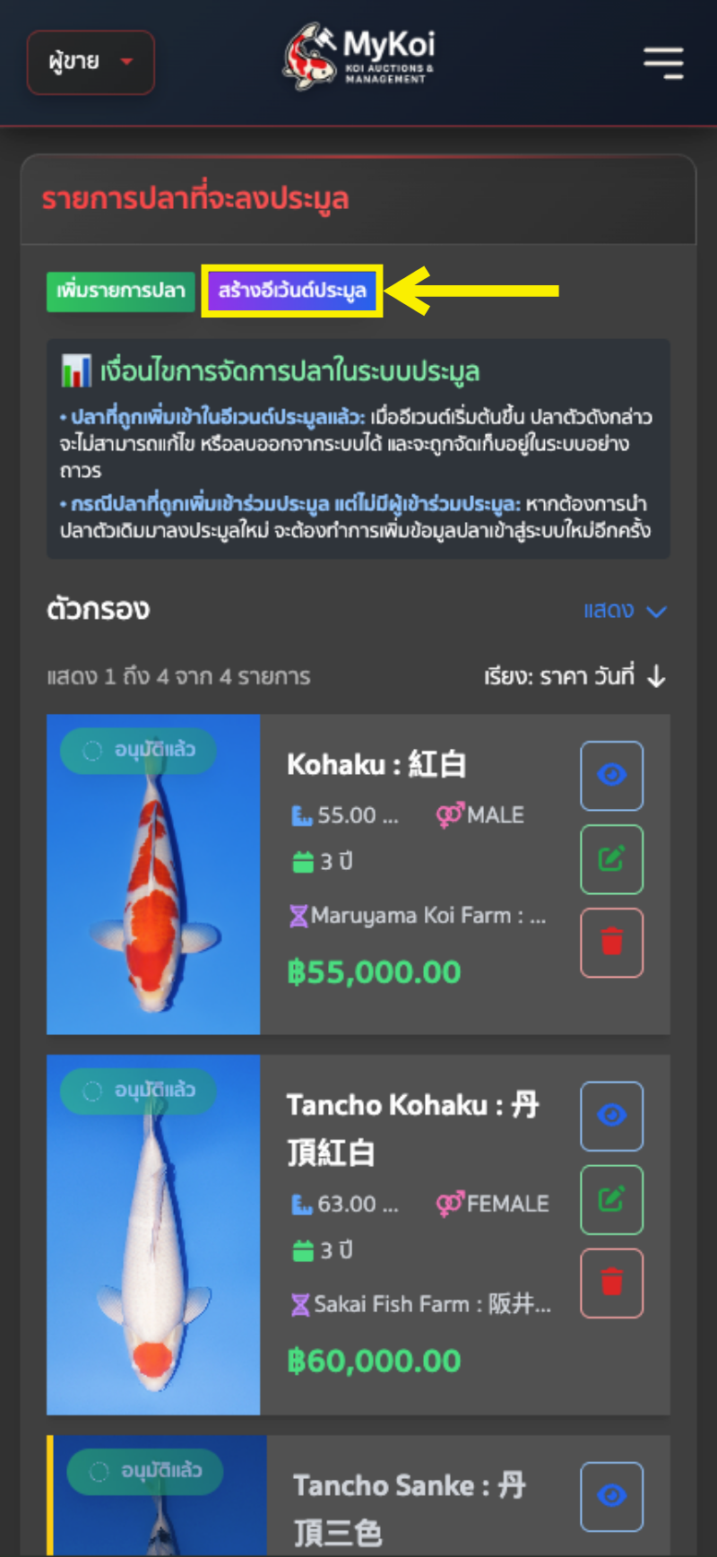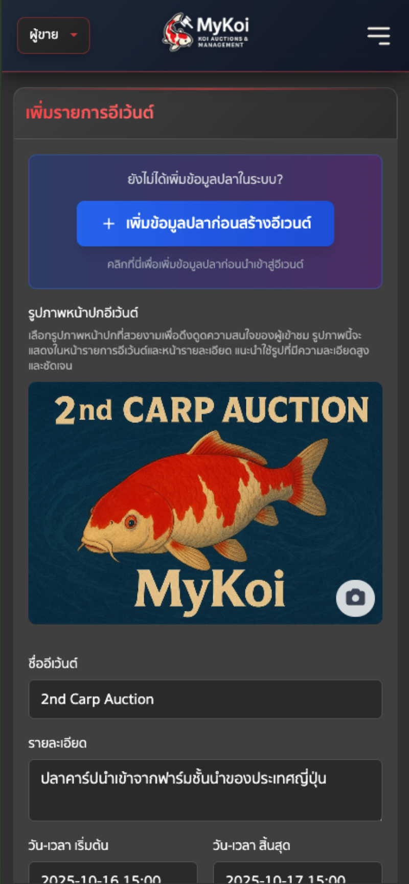 - วิธีที 1 : หลังจากเพิ่มรายการปลาที่จะลงประมูลแล้ว กดที่สร้างอีเว้นต์ประมูล ระบบจะพาไปยังเมนูเพิ่มรายการอีเว้นต์เลย