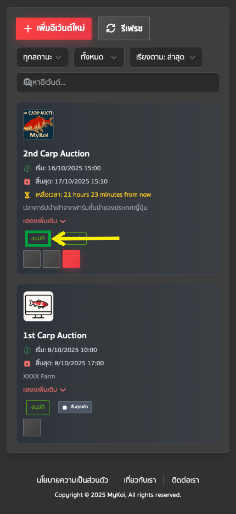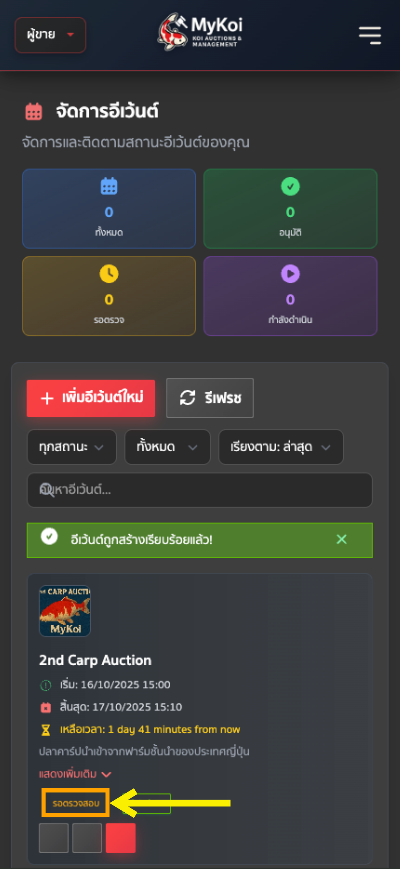 5. อีเว้นต์ที่คุณเพิ่ม จะต้องรอเจ้าหน้าที่ (Staff) ตรวจสอบก่อน สังเกตได้จากตัวหนังสือสีเหลือง เขียนว่า “รอตรวจสอบ” เมื่อเจ้าหน้าที่อนุมัติรายการประมูลแล้ว จะขึ้นตัวหนังสือสีเขียวว่า “อนุมัติ” เป็นอันเสร็จการเพิ่มอีเว้นต์ สำหรับการอนุมัติอีเว้นต์ จะมีเจ้าหน้าที่ตรวจสอบโดยเร็วที่สุด