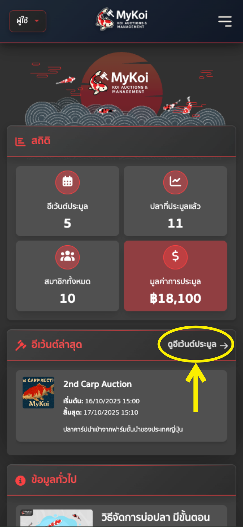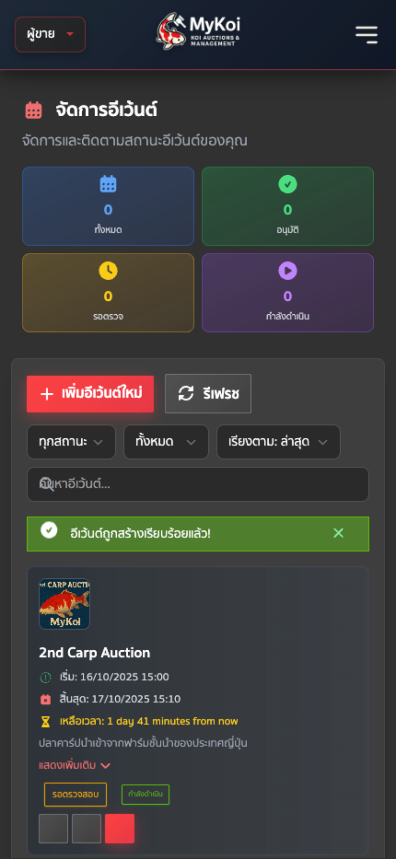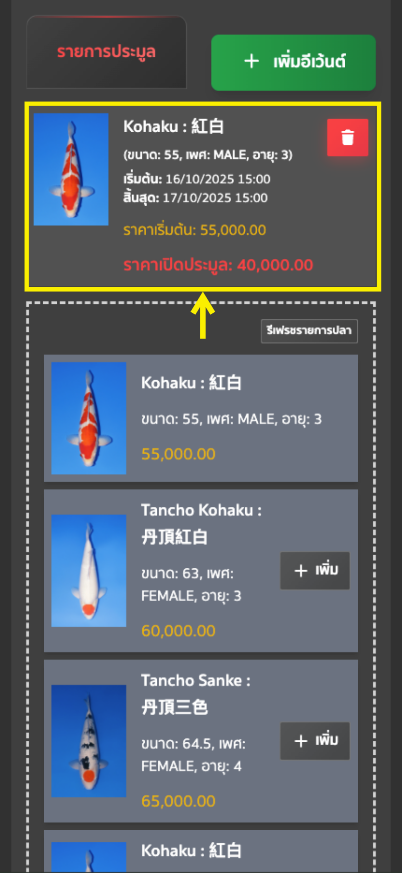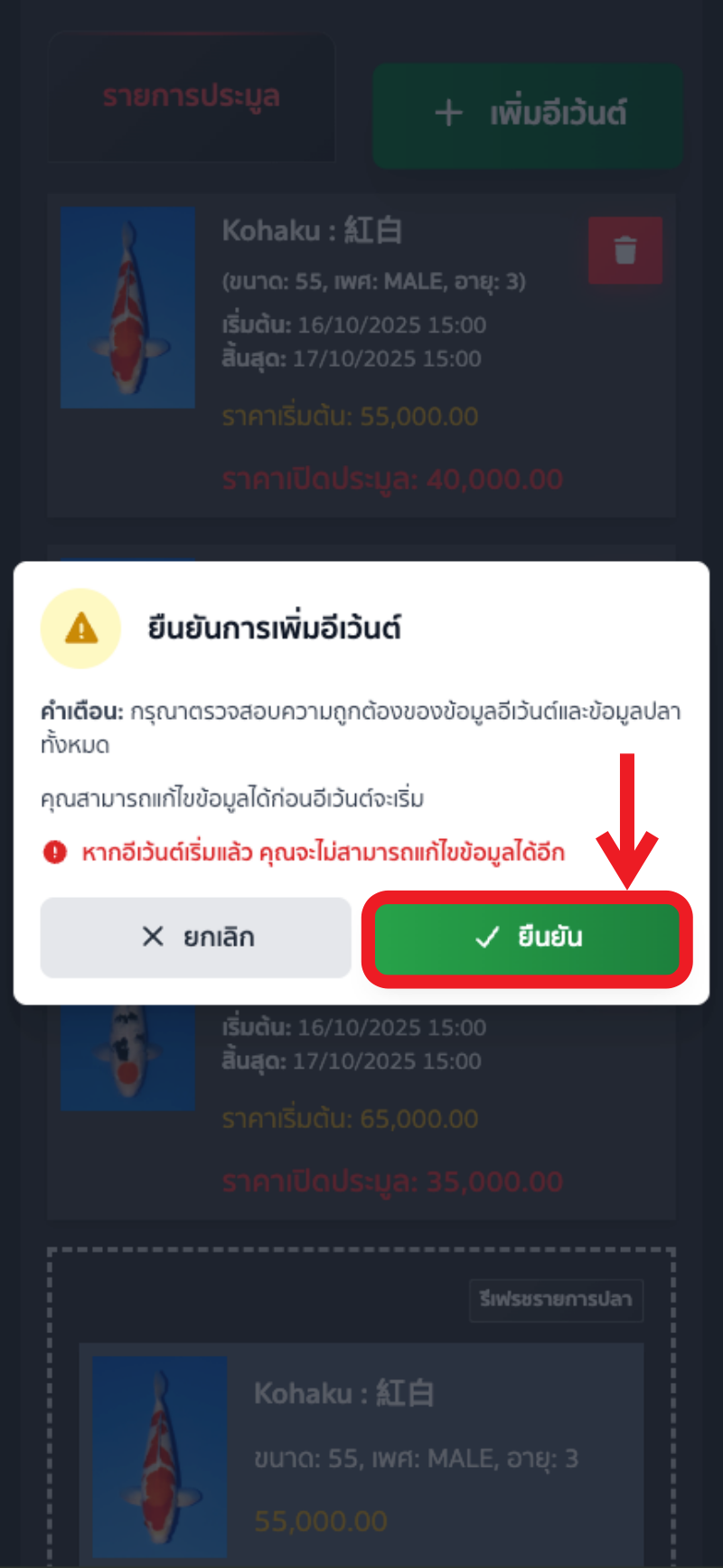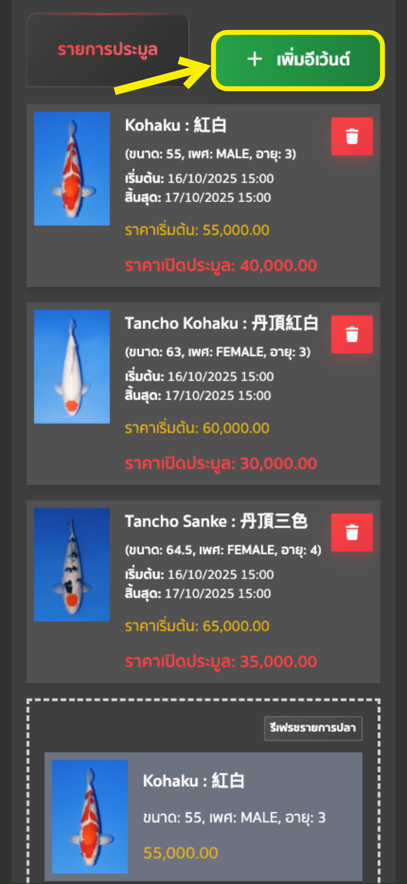 4. ระบบจะพามายังหน้ารายการประมูล ปลาที่เพิ่มรายการแล้วจะขึ้นมาอยู่ด้านบน สามารถกดเพิ่มปลาที่ต้องลงประมูลได้ตามต้องการเลย เมื่อเพิ่มครบแล้ว กด + เพิ่มอีเว้นต์ ระบบจะแจ้งเตือนยืนยันการเพิ่มอีเว้นต์* กดยืนยัน แล้วระบบจะขึ้นหน้าจัดการอีเว้นต์ สามารถดูรายการอีเว้นต์ที่คุณสร้างขึ้นได้จากหน้านี้เลย