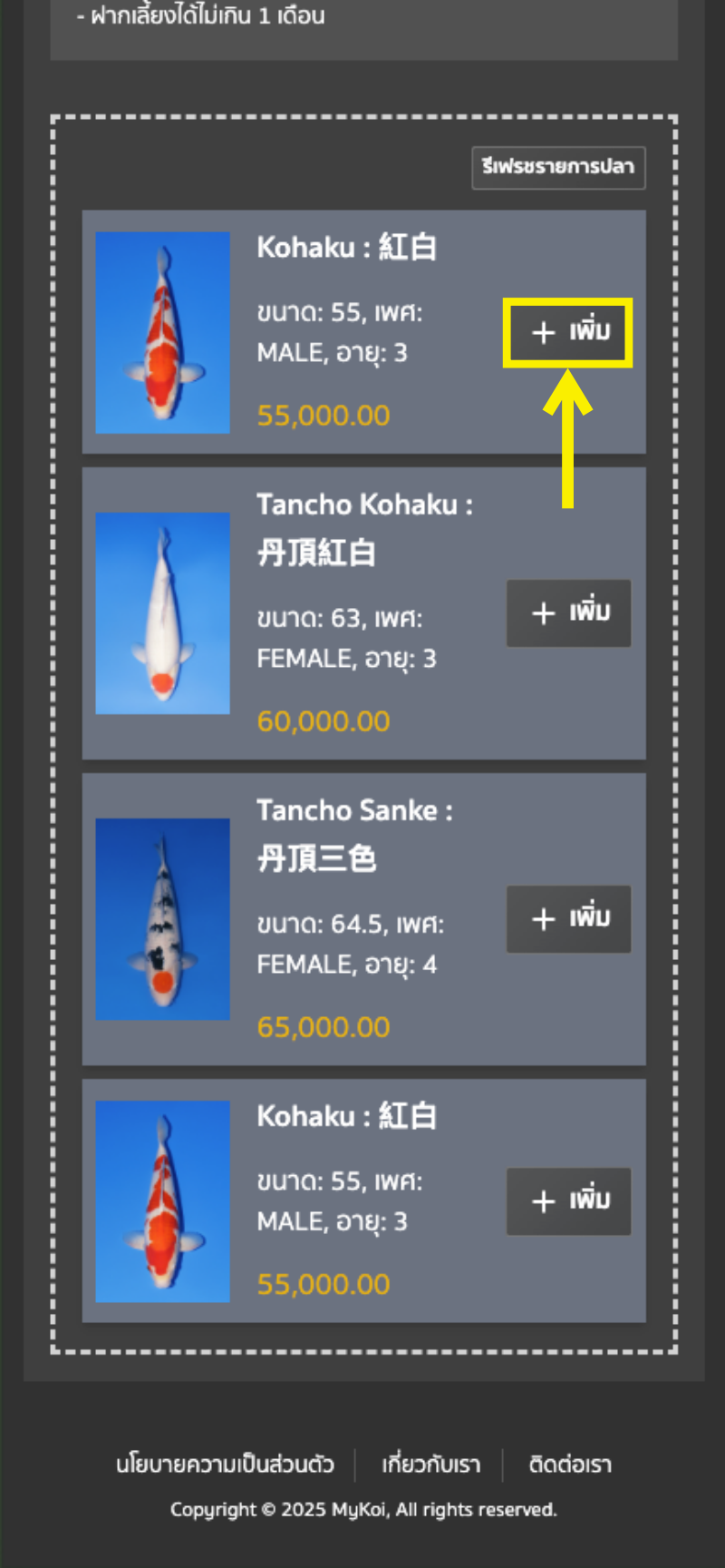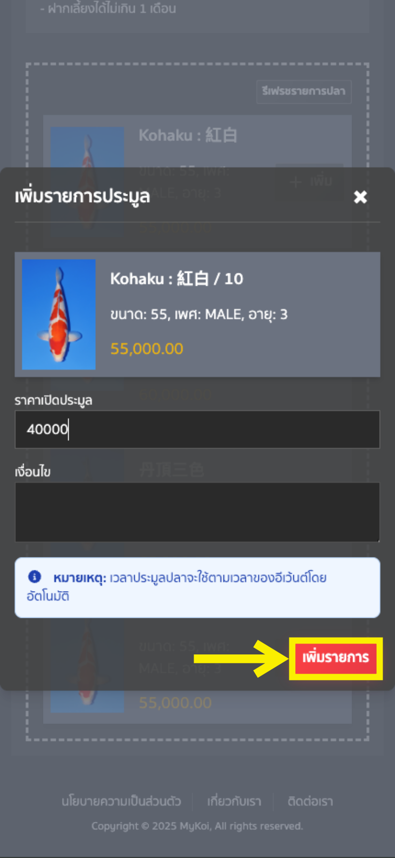 3. หน้าเว็บจะแสดงรายการปลาที่จะลงประมูลที่เราเพิ่มไว้ก่อนหน้านี้ ให้กด +เพิ่ม ในช่องปลาคาร์ปที่ต้องการจะประมูล จะมีหน้าเพิ่มรายการประมูลขึ้นมา กรอกราคาเปิดประมูล, เงื่อนไข และกดเพิ่มรายการ สามารถลงปลาประมูลได้สูงสุด 60 ตัว/อีเว้นต์