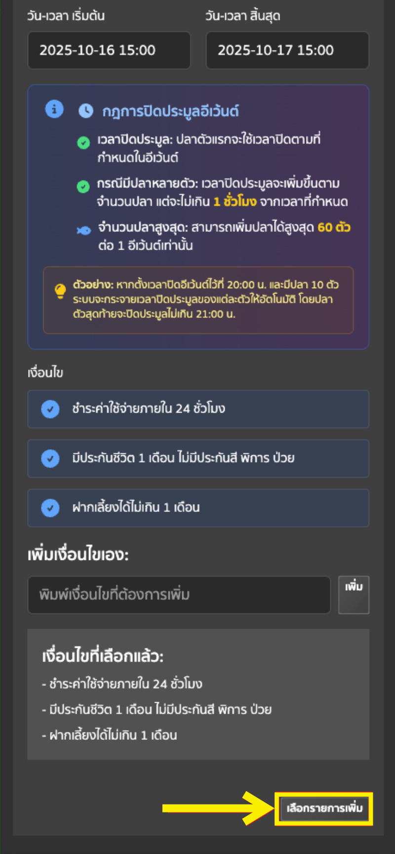 *หมายเหตุ กรุณาตรวจสอบความถูกต้องของข้อมูลอีเว้นต์และข้อมูลปลาทั้งหมดก่อนกดยืนยัน หากอีเว้นต์เริ่มแล้ว คุณจะไม่สามารถแก้ไขข้อมูลได้อีก