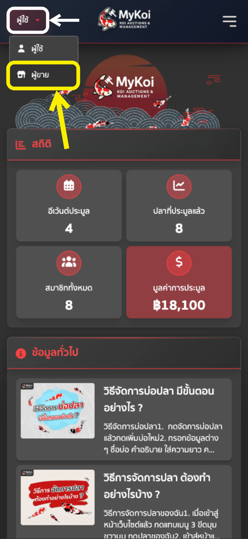 - วิธีที่ 2 : เมื่อเข้าสู่โหมดผู้ขายแล้ว เวลาเราเข้าสู่หน้าหลัก ระบบจะเปลี่ยนกลับไปเป็นโหมดผู้ใช้ ซึ่งตรงนี้สามารถกดที่คำว่าผู้ใช้มุมบนซ้าย เพื่อเปลี่ยนเป็นผู้ขายได้เลย จะพบกับหน้าเมนูหลักในโหมดผู้ขาย แล้วกดรายการอีเว้นต์ วิธีนี้จะพาไปยังหน้าจัดการอีเว้นต์ แล้วกดเพิ่มอีเว้นต์ใหม่