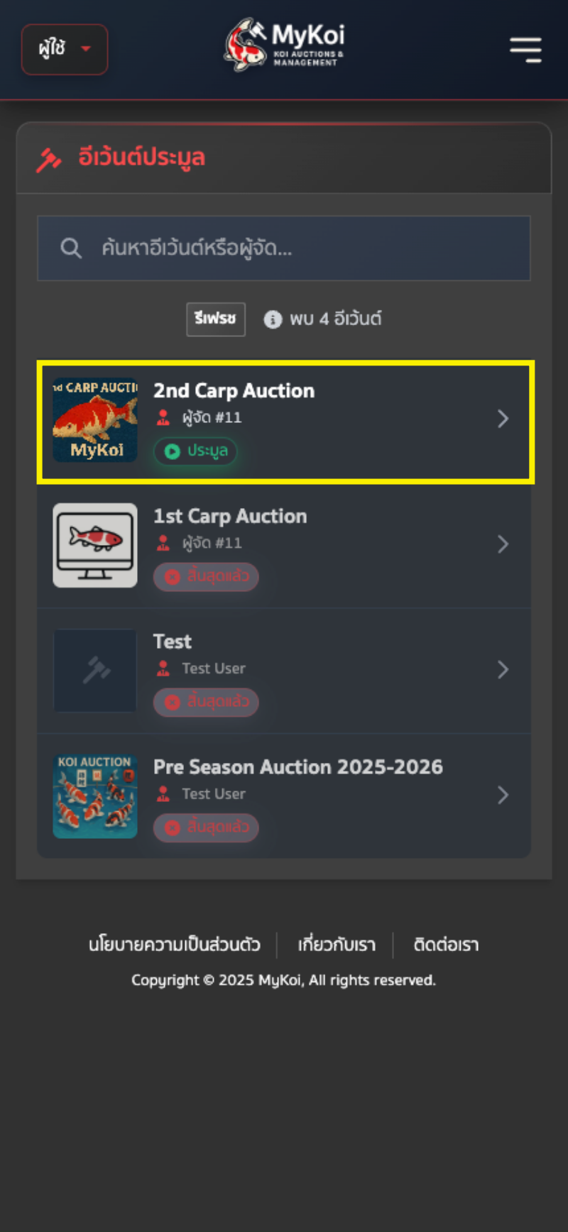 6. จากนั้นรอตามวันเวลาที่เรากำหนด แล้วอีเว้นต์ที่เราเพิ่มจะเริ่มขึ้น สามารถเปลี่ยนโหมดจากผู้ขายไปเป็นผู้ใช้ เพื่อดูอีเว้นต์ล่าสุดได้ โดยกดที่ดูอีเว้นต์ประมูล จะมีรายการอีเว้นต์แสดงเรียงตามวันที่เริ่ม ซึ่งทั้งหมดจะเป็นอีเว้นต์ที่แอดมินอนุมัติแล้ว