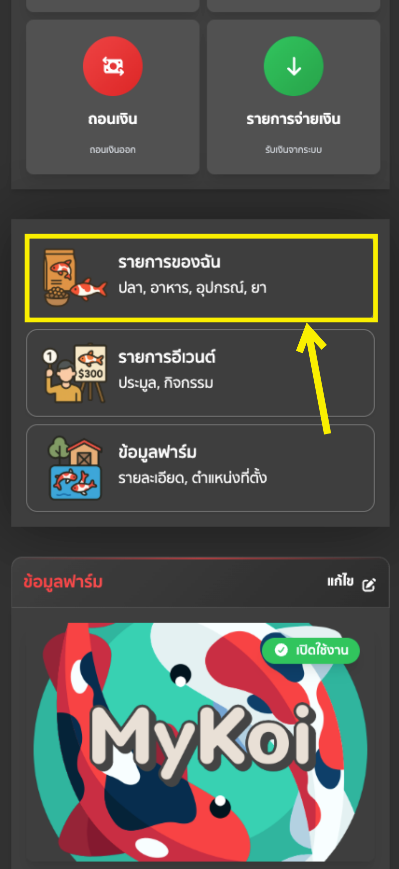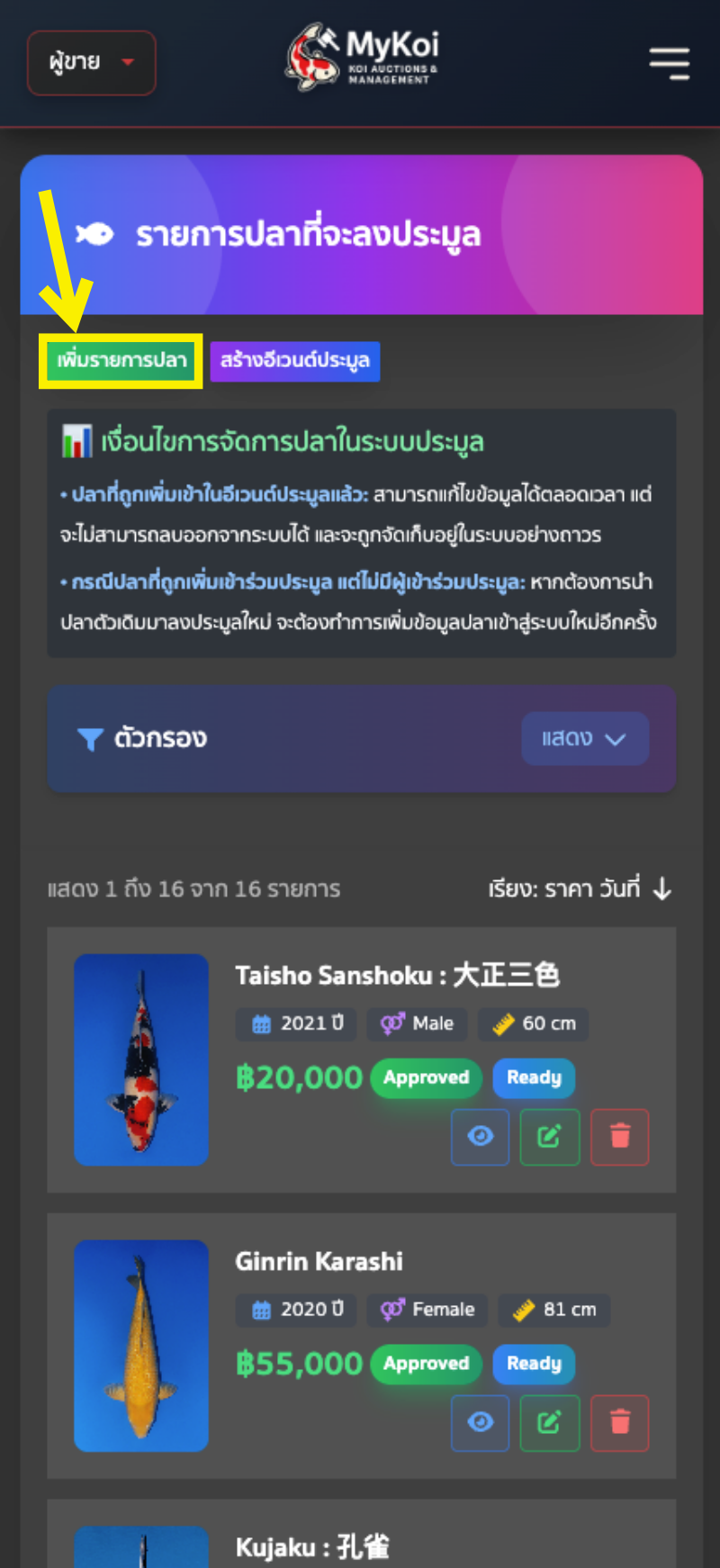 - วิธีที่ 2 : กดที่รายการปลาของฉัน จะพบกับหน้ารายการปลาที่จะลงประมูล กดเพิ่มรายการ ซึ่งเมนูนี้จะเป็นการเพิ่มปลาที่ต้องการเปิดประมูล