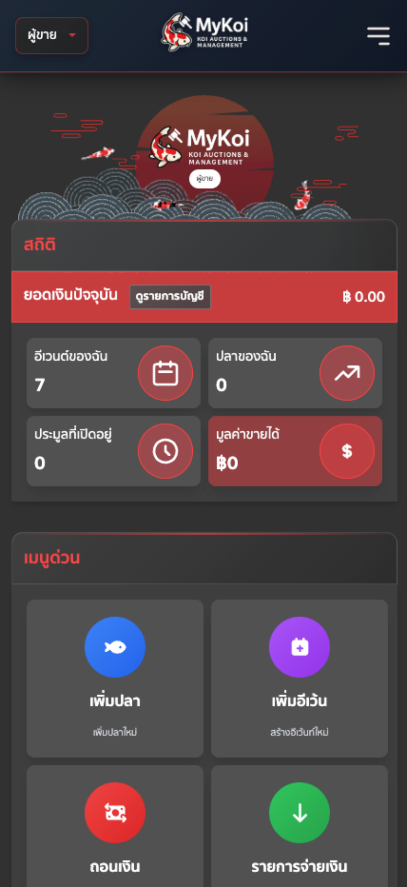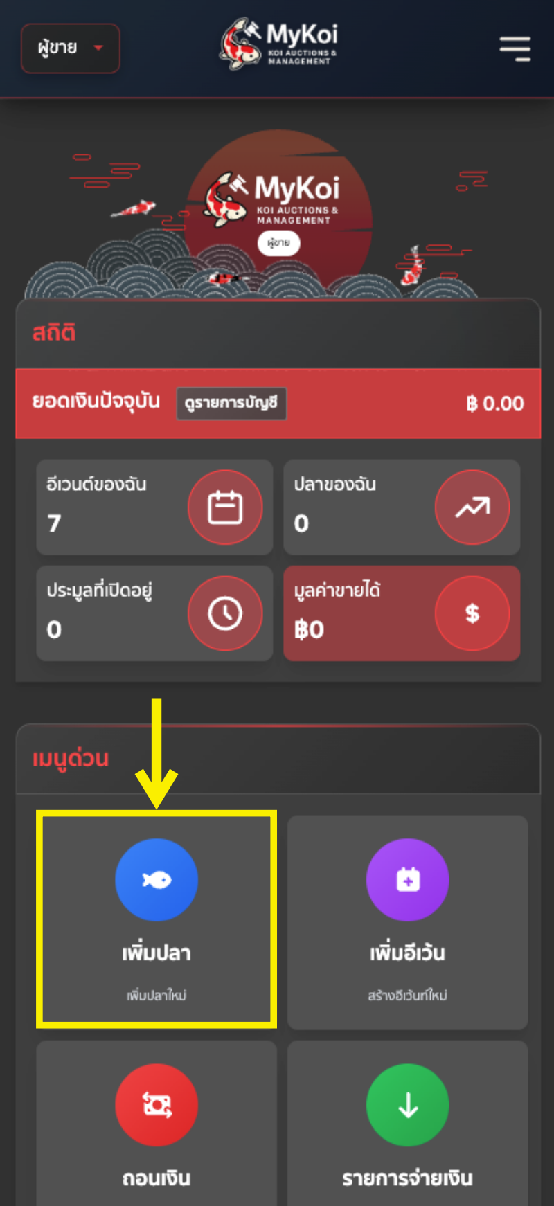 - วิธีที่ 1 : สังเกตตรงเมนูด่วน กดเพิ่มปลา แล้วระบบจะพาไปยังหน้าเพิ่มปลาเข้าประมูล