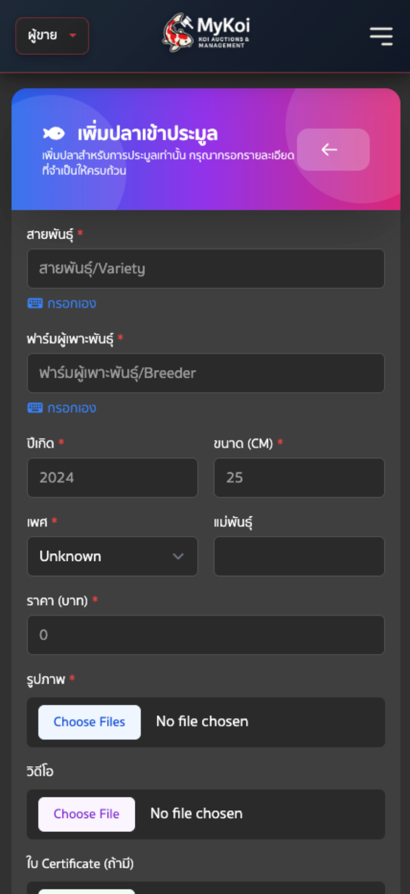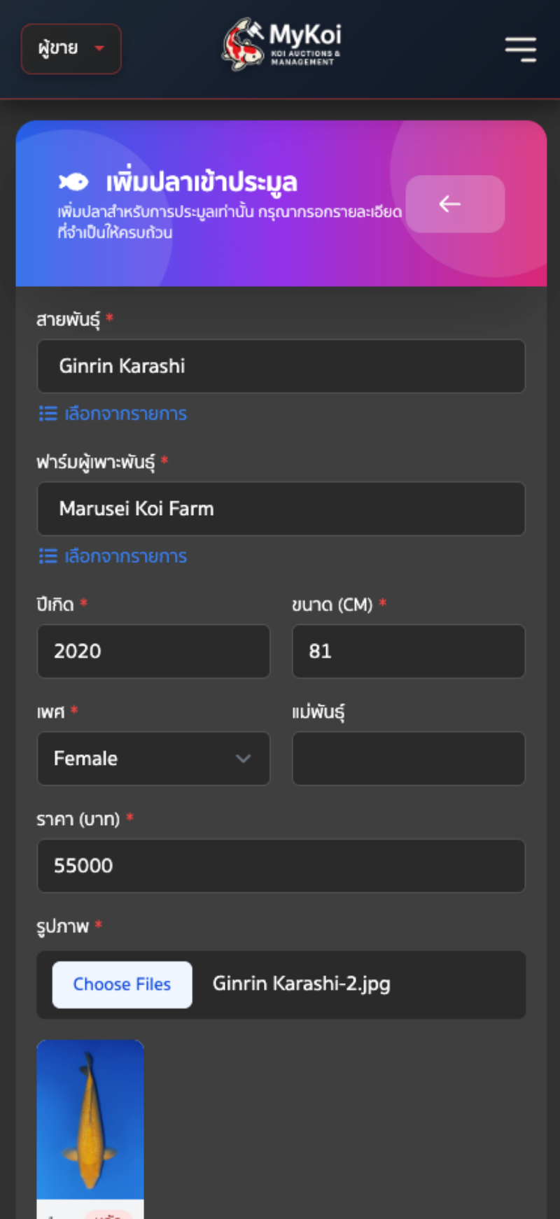 6. ระบบจะพามายังหน้าข้อมูลปลา กรอกรายละเอียดของปลา อัปโหลดรูปภาพ*, อัปโหลดวิดีโอ, สายพันธุ์*, ฟาร์มผู้เพาะพันธุ์*, เพศ*, แม่พันธุ์ปลา, อายุ*, ขนาด* และราคา* ส่วนใบเซอร์จะเป็นการเลือกระหว่าง มีใบเซอร์และไม่มีใบเซอร์ กดเลือกตามข้อมูลปลาได้เลย สำหรับรายละเอียด หากมีรายละเอียดอื่น ๆ เพิ่มเติมเกี่ยวปลาตัวนี้ อาทิ ลักษณะเฉพาะ รางวัลที่ได้ สามารถพิมพ์ลงในช่องว่างได้เลย จากนั้นกดเพิ่มรายการปลา
