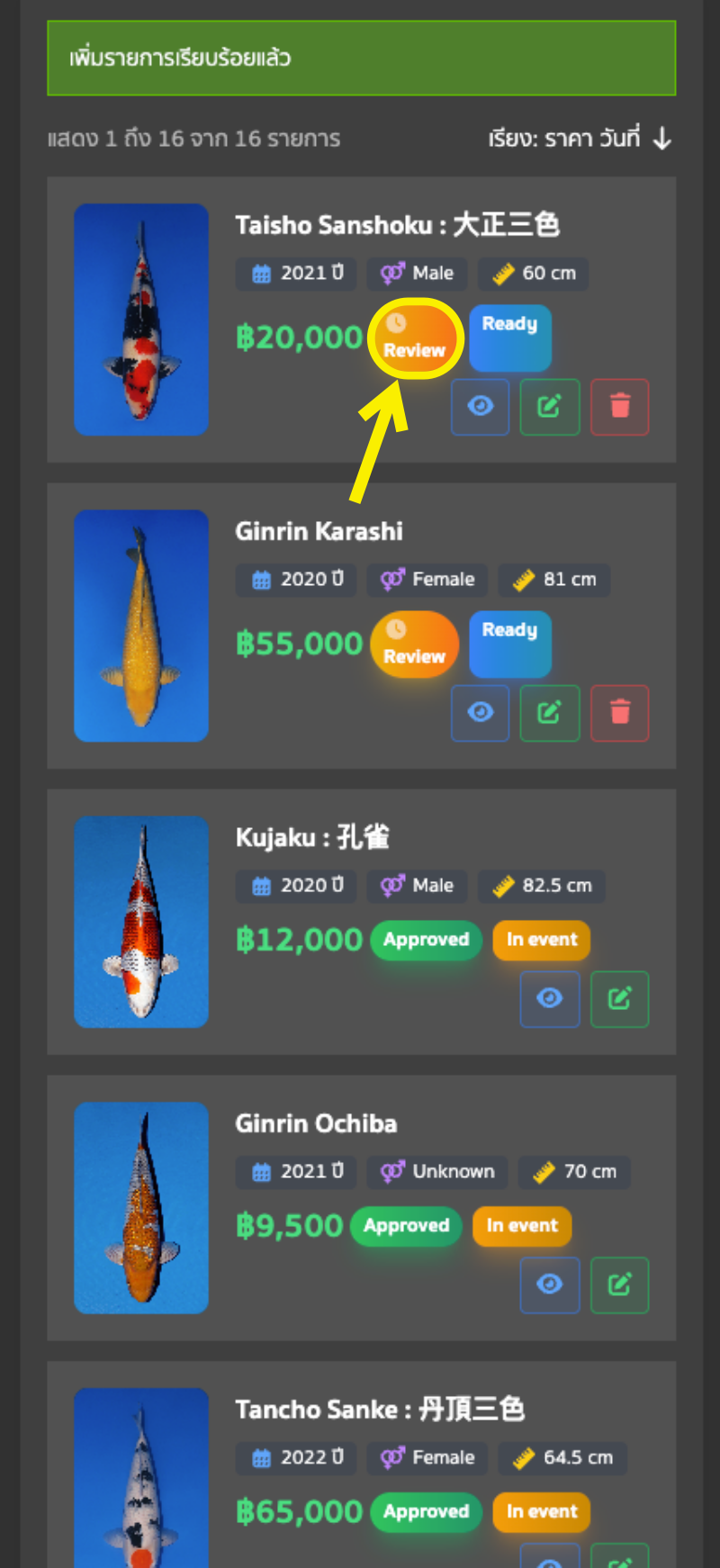 7. เมื่อกดเพิ่มรายการปลา ระบบจะพากลับมายังหน้ารายการปลาที่จะลงประมูล จะมีรายการปลาที่เพิ่มไว้แสดงอยู่ สังเกตตรงรูปปลา จะมีกรอบสีเหลืองเขียนว่า “REVIEW” ซึ่งตรงส่วนนี้แอดมิน (Staff) จะทำการตรวจสอบปลาของคุณก่อน เมื่อได้รับการอนุมัติแล้ว จะมีกรอบสีเขียวขึ้นว่า “Approved” และมีคำว่า Ready ต่อท้าย ซึ่งหมายถึงปลาพร้อมประมูลแล้ว (สร้างอีเว้นต์ประมูลได้เลย) สำหรับการอนุมัติรายการปลาที่จะลงประมูล จะมีเจ้าหน้าที่ตรวจสอบโดยเร็วที่สุด