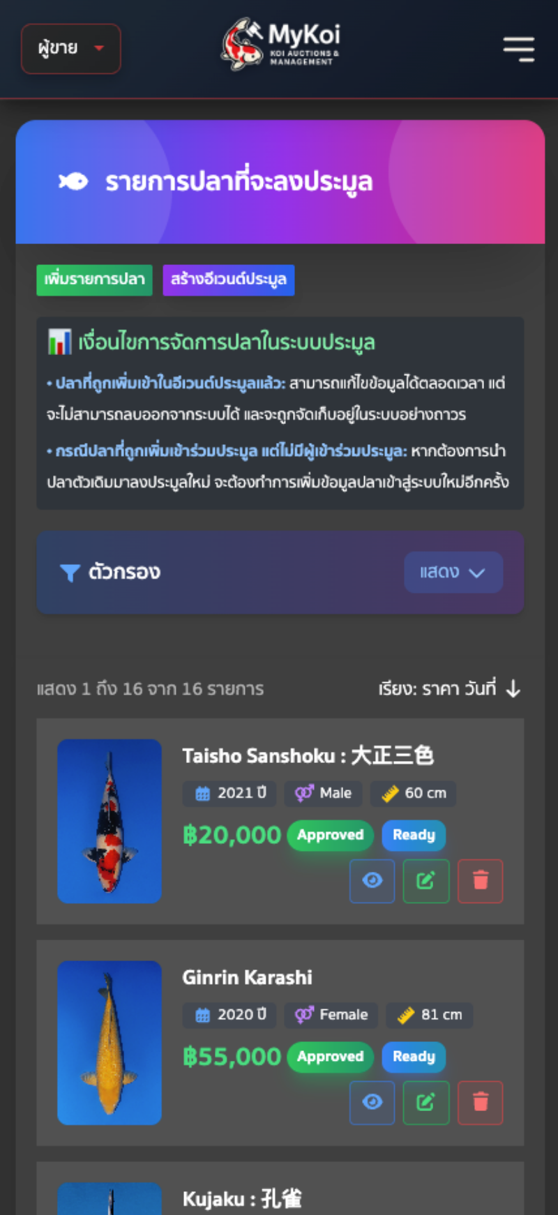 8. หลังจากเพิ่มรายการปลาที่จะลงประมูล และแอดมินอนุมัติปลาเรียบร้อยแล้ว เป็นอันเสร็จ สามารถสร้างอีเว้นต์ประมูลได้เลย