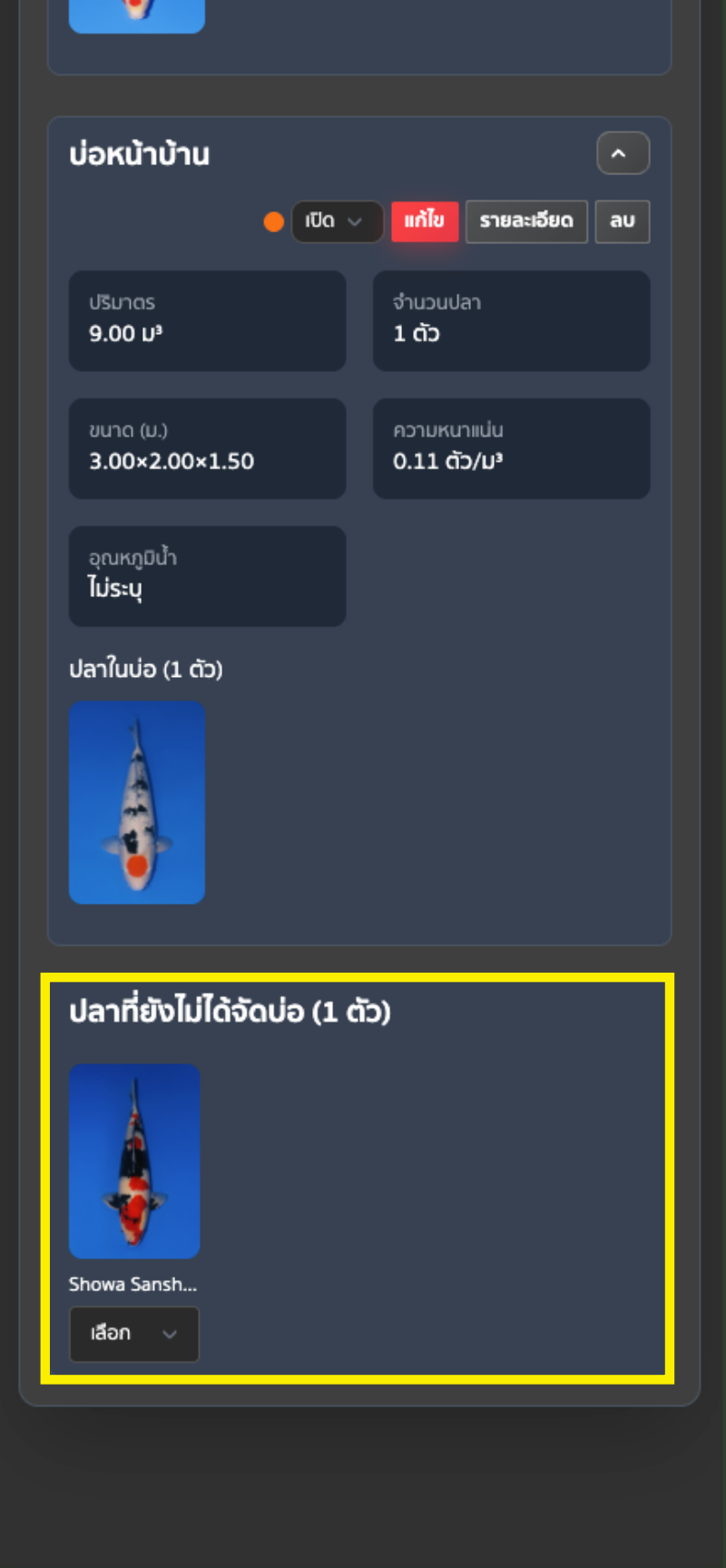 3. เว็บไซต์จะพาไปยังหน้าแดชบอร์ด ให้เลื่อนลงมาด้านล่าง กดจัดการบ่อปลา จะพบกับข้อมูลบ่อที่เราเพิ่มไว้ก่อนหน้านี้ และปลาที่ยังไม่ได้จัดบ่อ ให้เราเพิ่มปลาในบ่อโดยการกดเลือก แล้วเลือกบ่อที่ต้องการ ระบบจะเพิ่มปลาในบ่อ