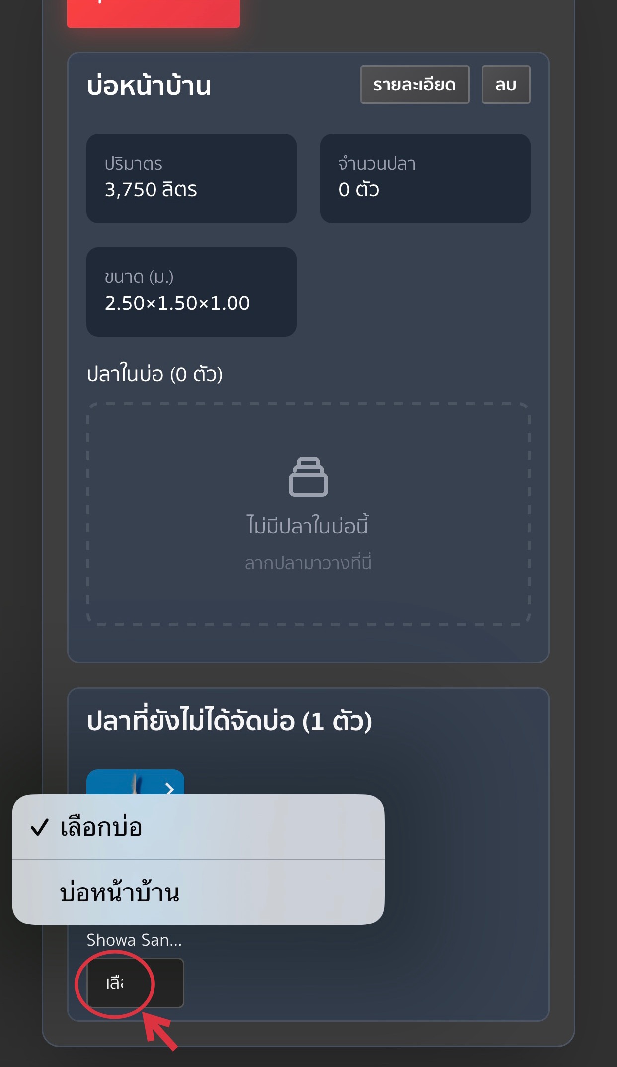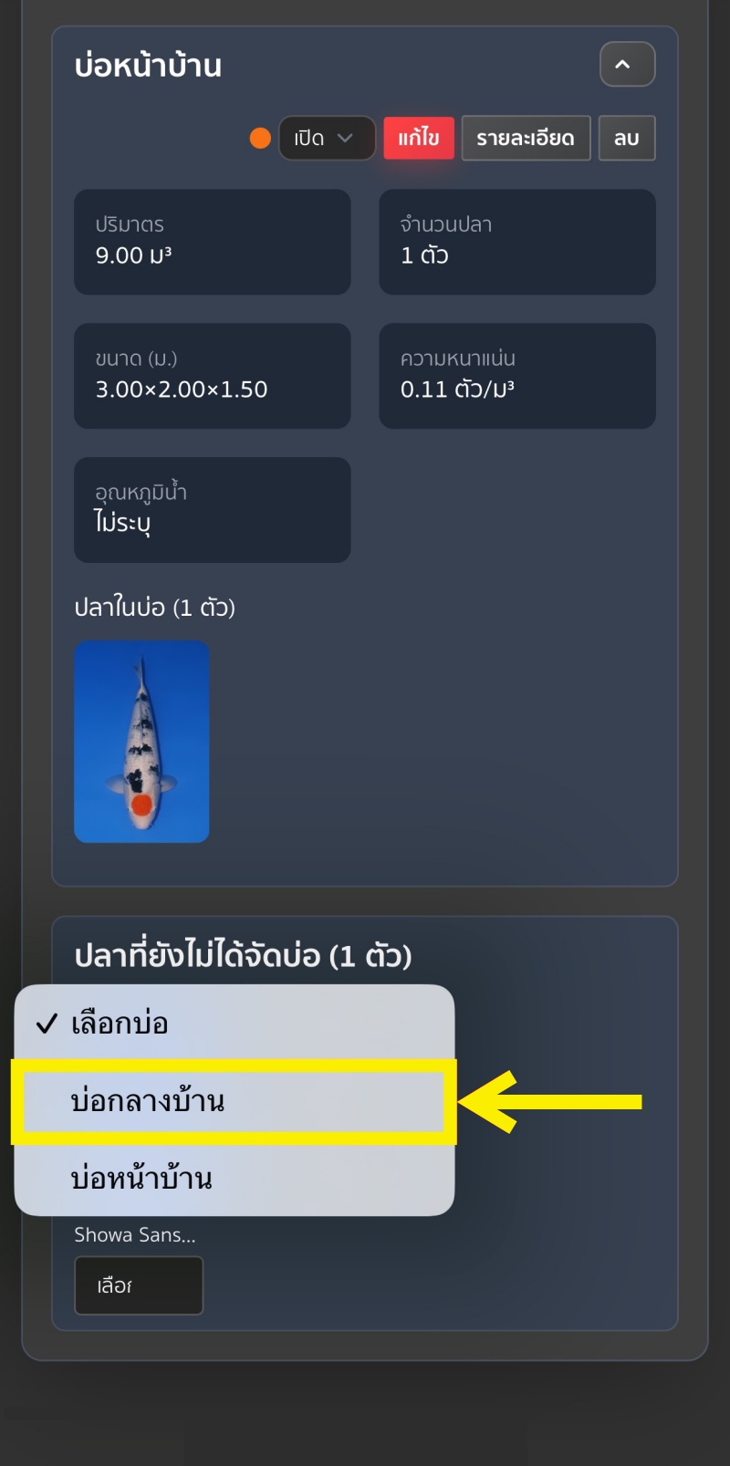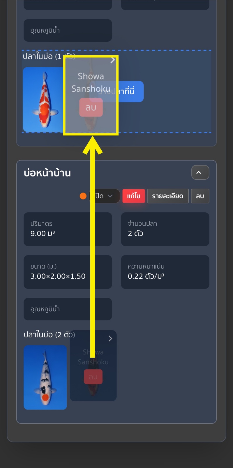 - วิธีที่ 1 : กดที่รูปของปลาที่เราต้องการย้ายบ่อ จะมีข้อความว่า ลบ ขึ้นมา ปลาที่ลบแล้วจะย้ายไปอยู่ที่เมนูปลาที่ยังไม่ได้จัดบ่อ ทำการกดเลือกปลาที่ต้องการย้ายบ่อด้านล่าง เลือกบ่อที่ต้องการ แล้วระบบจะเพิ่มปลาในบ่อที่คุณเลือก เป็นอันเสร็จ