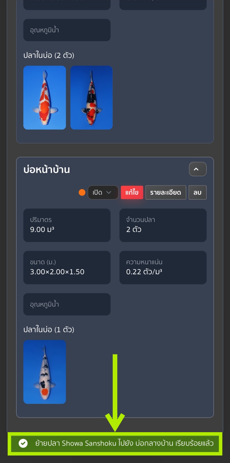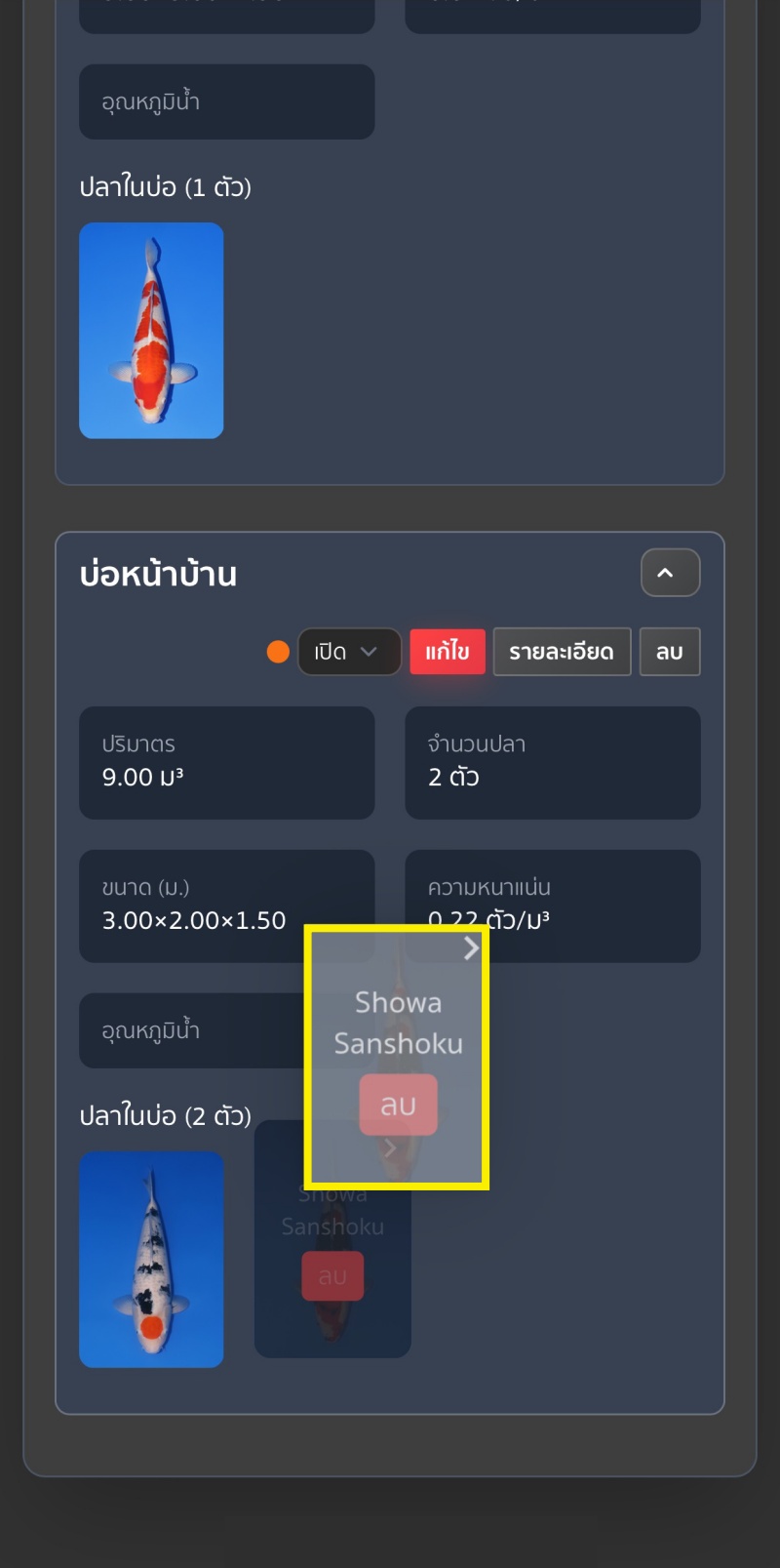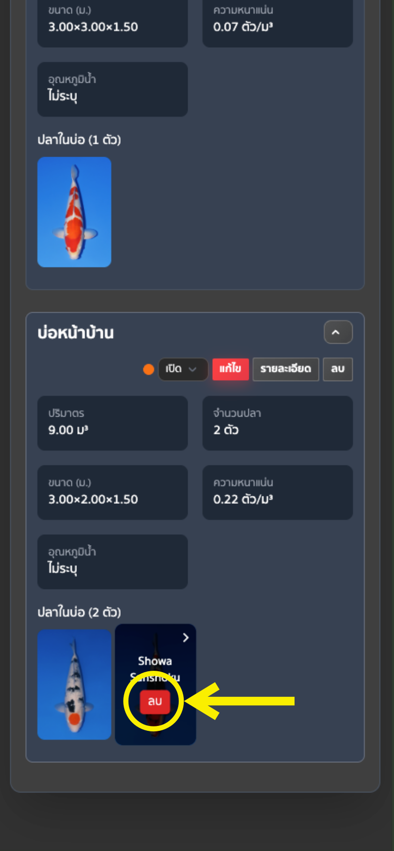 - วิธีที่ 1 : กดที่รูปของปลาที่เราต้องการย้ายบ่อ จะมีข้อความว่า ลบ ขึ้นมา ปลาที่ลบแล้วจะย้ายไปอยู่ที่เมนูปลาที่ยังไม่ได้จัดบ่อ ทำการกดเลือกปลาที่ต้องการย้ายบ่อด้านล่าง เลือกบ่อที่ต้องการ แล้วระบบจะเพิ่มปลาในบ่อที่คุณเลือก เป็นอันเสร็จ