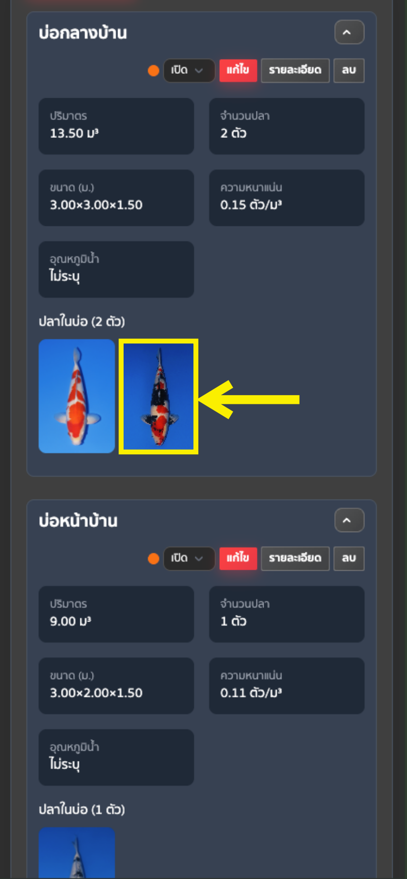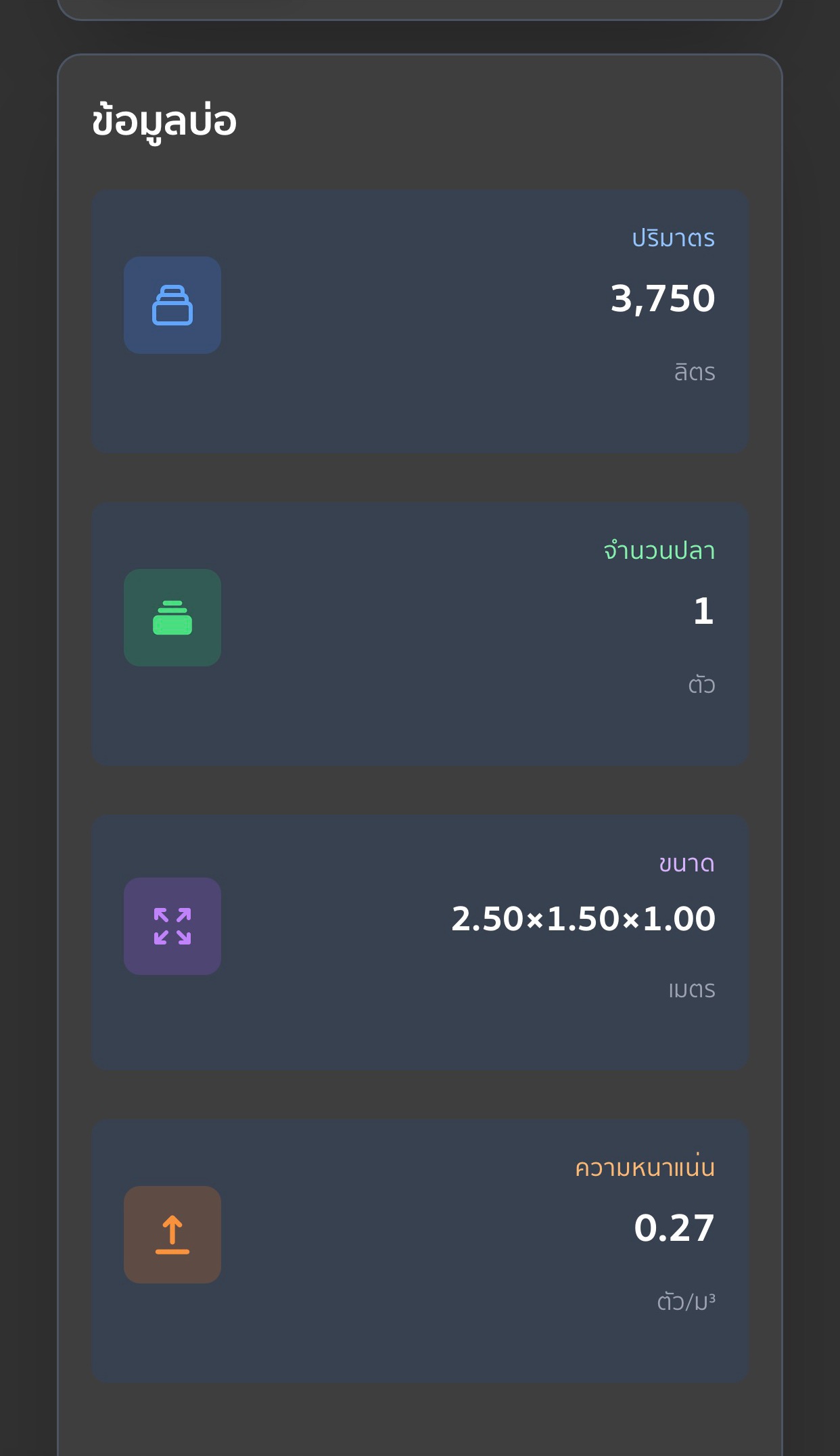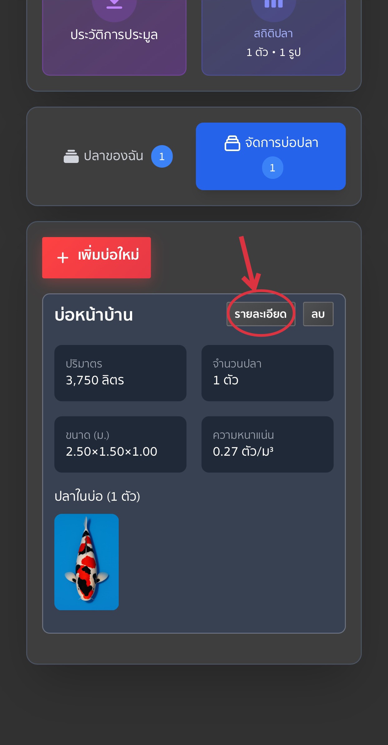5. เราสามารถเช็คบ่อ เพื่อจัดการข้อมูลบ่อปลาและปลาในบ่อ โดยการกดรายละเอียด จะขึ้นข้อมูลทั่วไป อาทิ ข้อมูลบ่อ, ปริมาตรของบ่อ (ระบบคำนวณให้), จำนวนปลา, ขนาดบ่อ และความหนาแน่นของปลาต่อบ่อ รวมถึงสถิติบ่อปลา การแบ่งตามเพศ อายุปลา และข้อมูลขนาดปลาที่เราบันทึกไว้