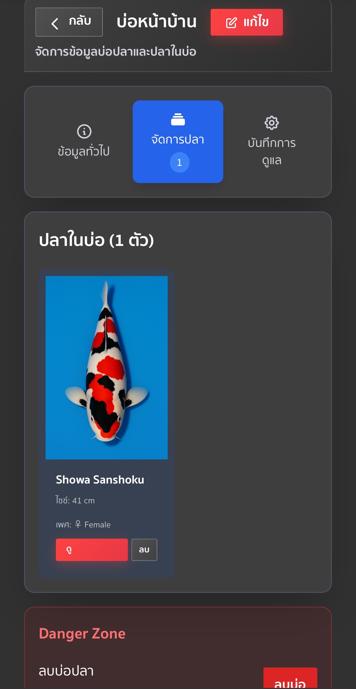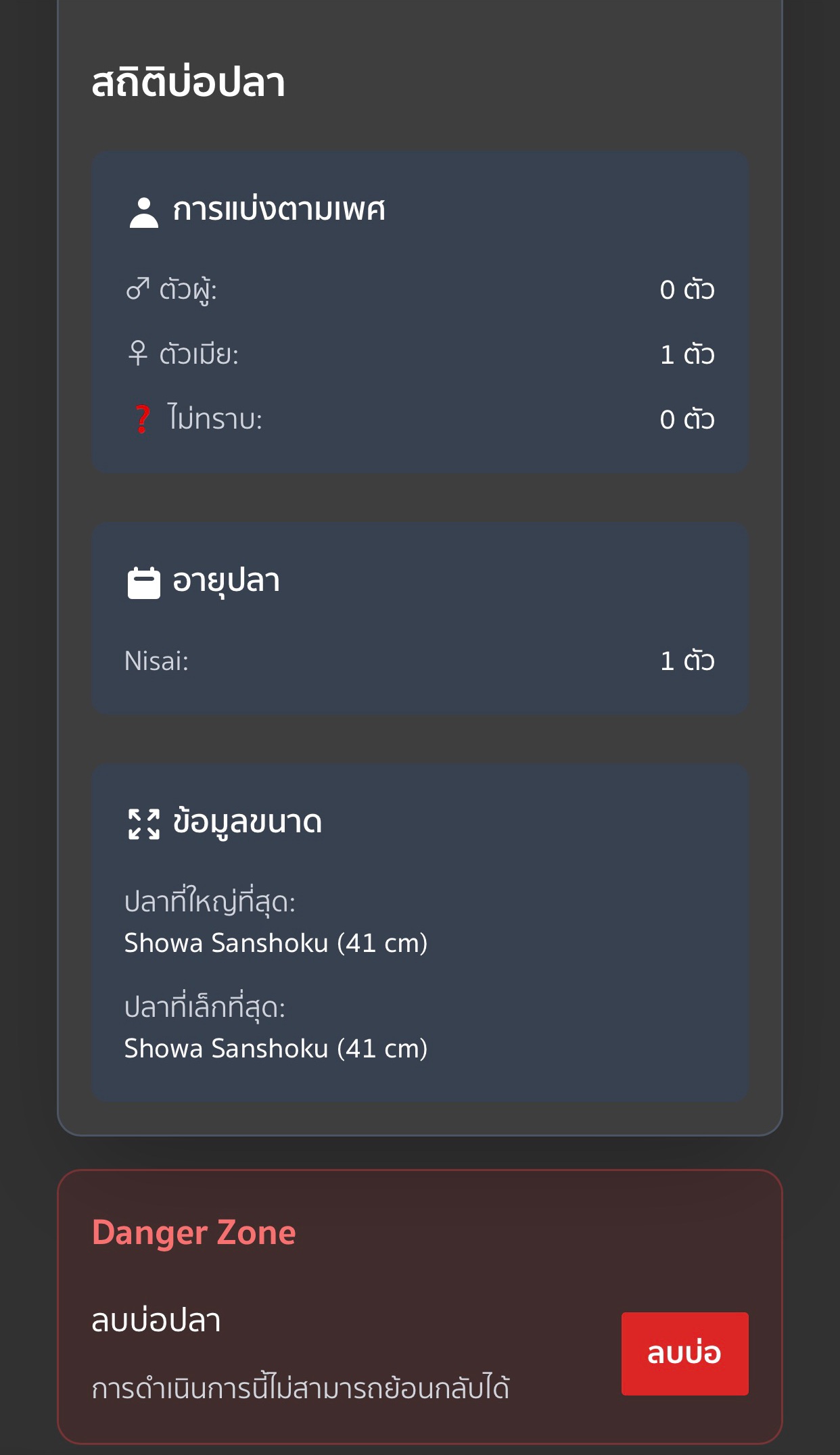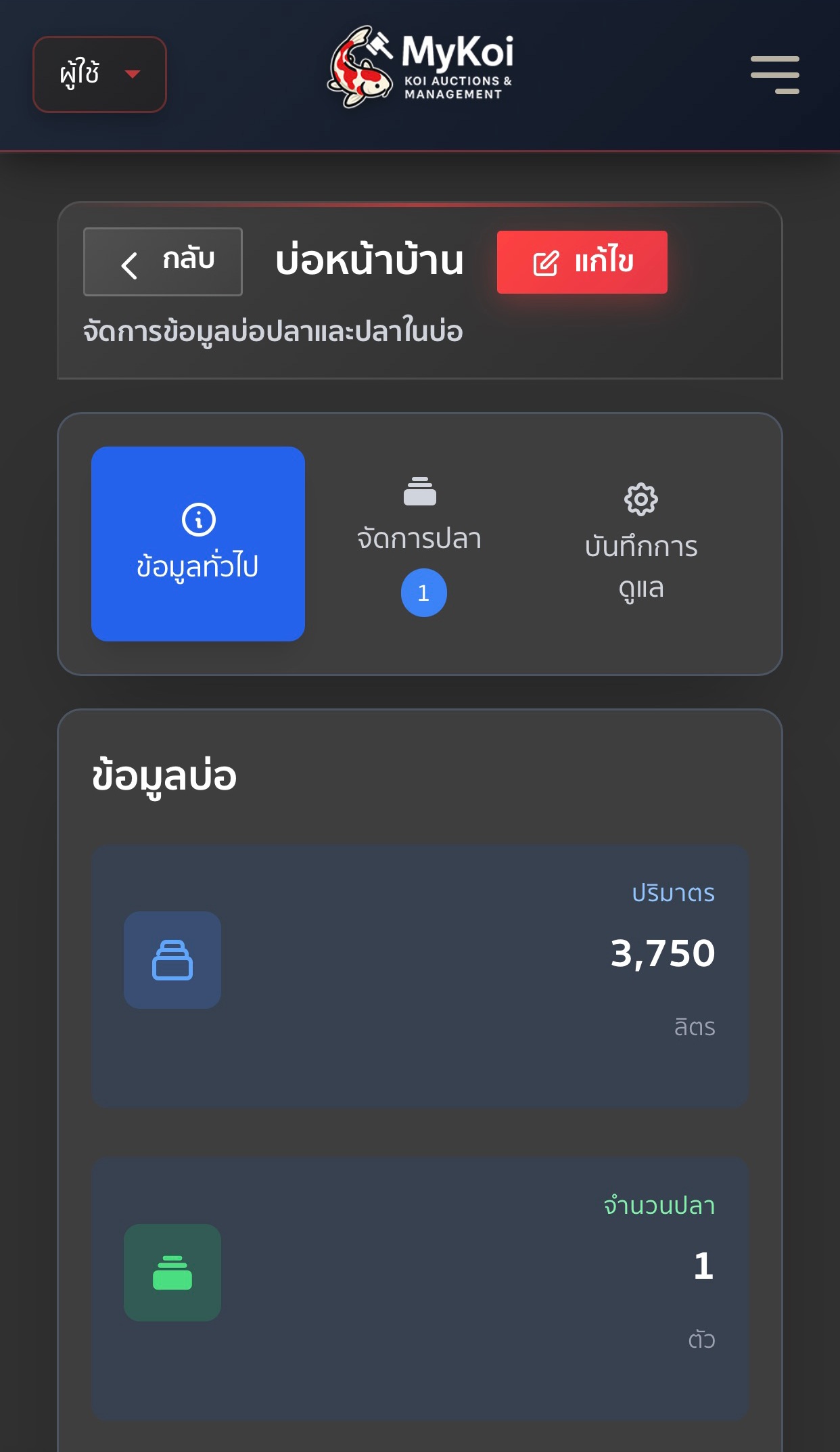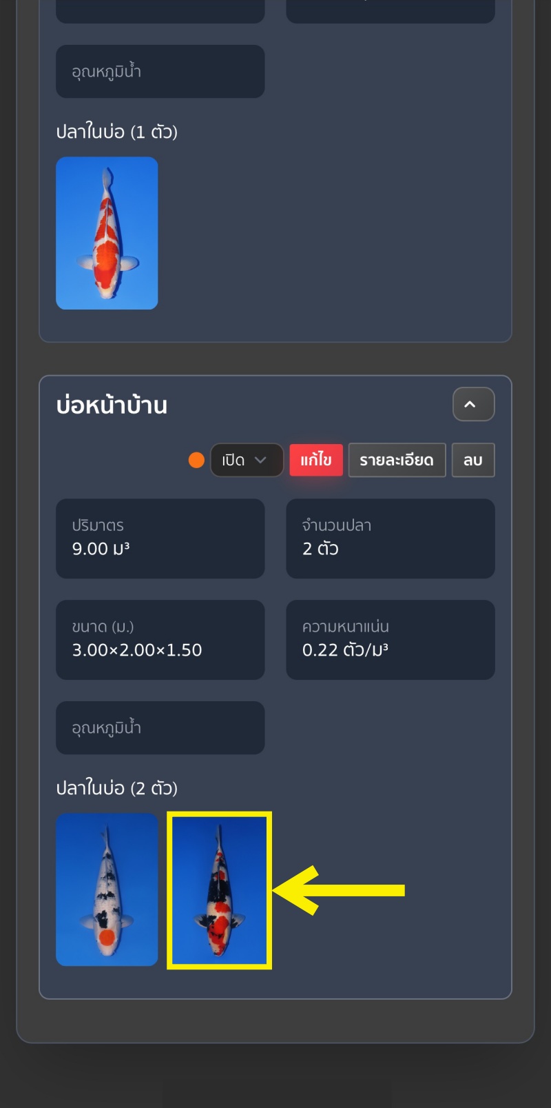 5. เราสามารถเช็คบ่อ เพื่อจัดการข้อมูลบ่อปลาและปลาในบ่อ โดยการกดรายละเอียด จะขึ้นข้อมูลทั่วไป อาทิ ข้อมูลบ่อ, ปริมาตรของบ่อ (ระบบคำนวณให้), จำนวนปลา, ขนาดบ่อ และความหนาแน่นของปลาต่อบ่อ รวมถึงสถิติบ่อปลา การแบ่งตามเพศ อายุปลา และข้อมูลขนาดปลาที่เราบันทึกไว้