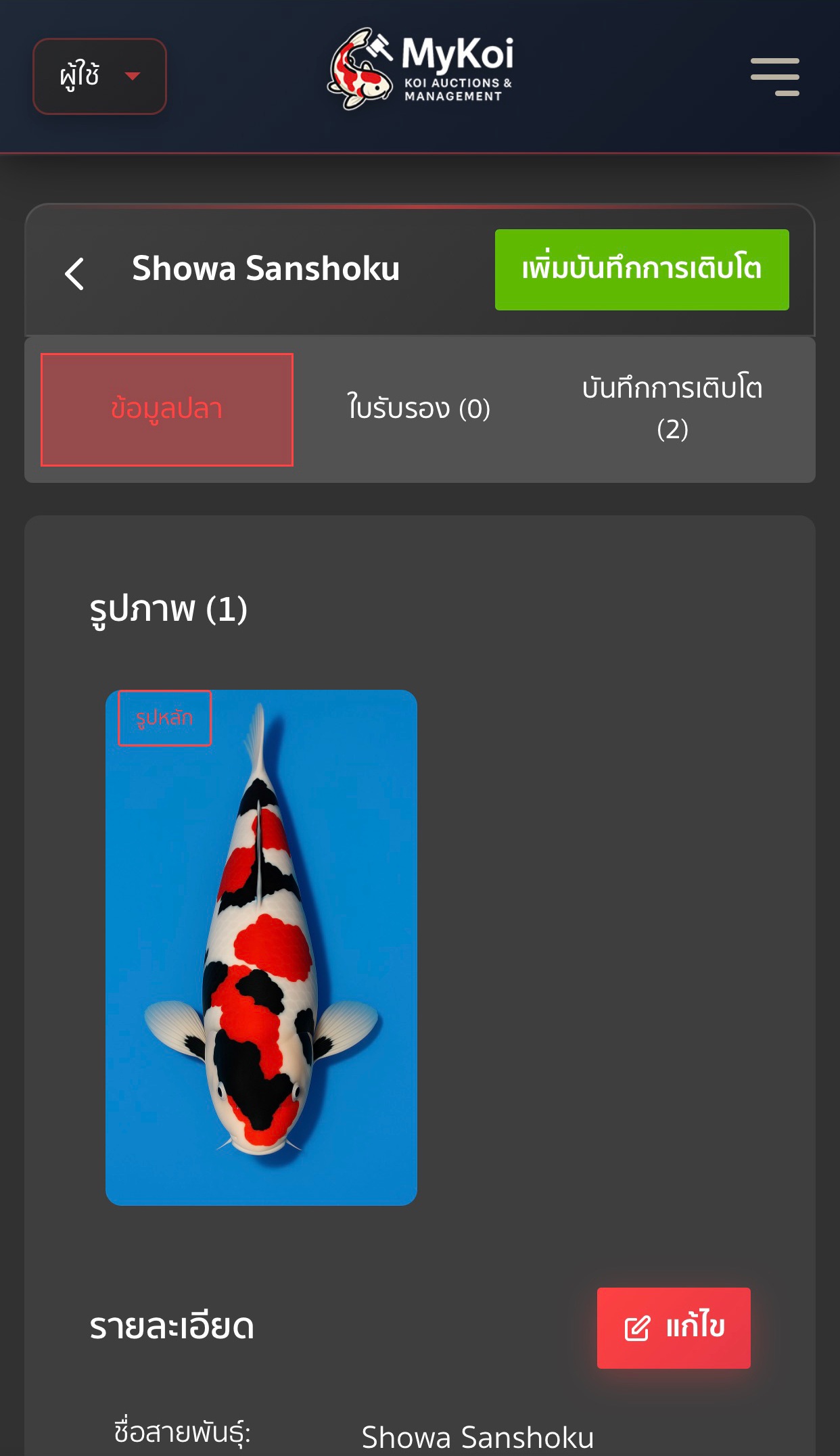 6. เมนูจัดการปลา หน้าเว็บไซต์จะขึ้นปลาในบ่อที่เราเลือกไว้ เราสามารถกดดูรายละเอียดของปลาได้ หน้าเว็บจะพาไปยังหน้าการจัดการปลาที่มีข้อมูลปลา ใบรับรอง และบันทึกการเติบโต