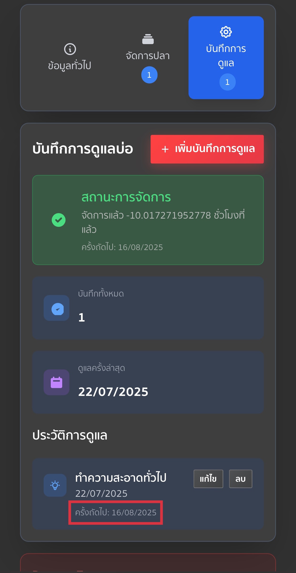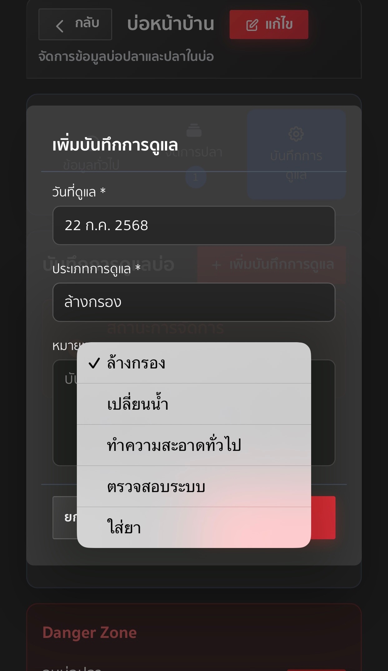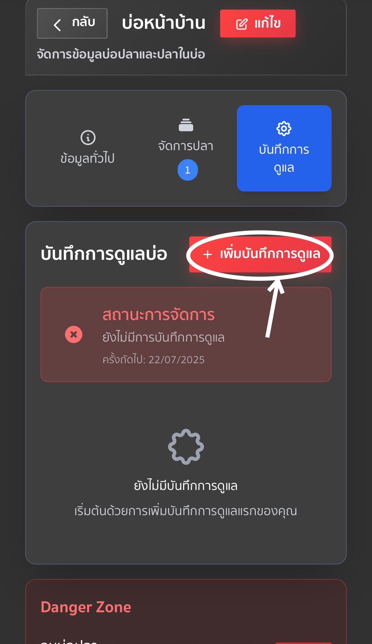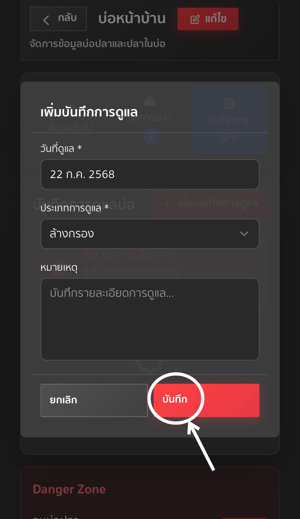 7. ส่วนเมนูบันทึกการดูแล เป็นบันทึกการดูแลบ่อของเรา กดเพิ่มบันทึกการดูแลบ่อ จะขึ้นเพิ่มบันทึกการดูแล สามารถกรอกวันที่ดูแล ประเภทการดูแล อาทิ ล้างกรอง เปลี่ยนน้ำ ทำความสะอาดทั่วไป กดเลือกได้เลย และหากต้องการเพิ่มหมายเหตุ ก็พิมพ์ใส่ แล้วกดบันทึกได้เลย เราสามารถเช็คประวัติบันทึกการดูแลบ่อได้จากเมนูนี้ รวมถึงระบบจะแจ้งวันที่ต้องดูแลครั้งถัดไปอีกด้วย หรือก็คือ ทุก ๆ 15 วัน นั่นเอง