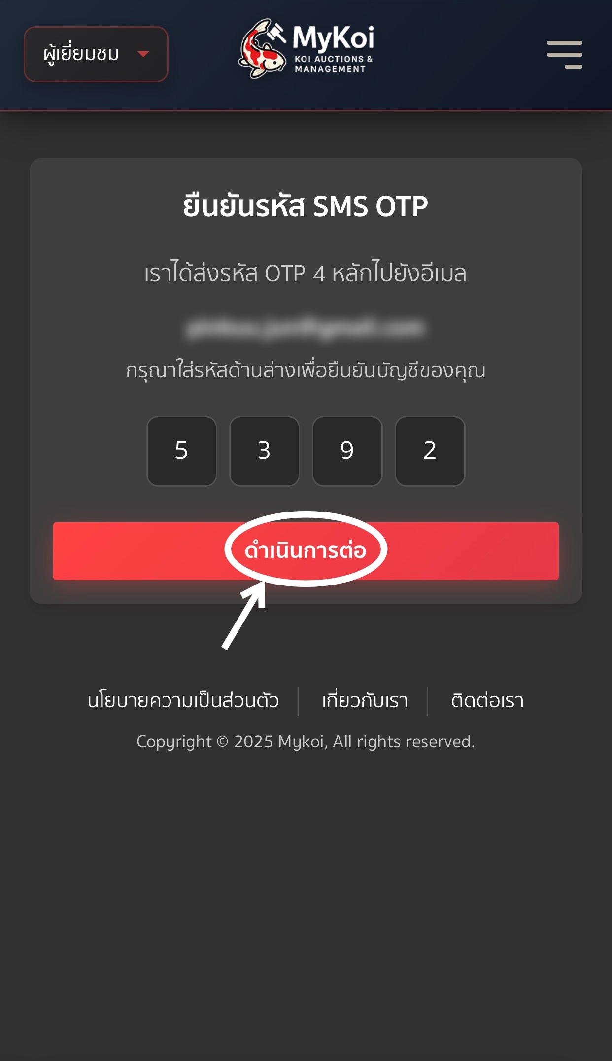 4. เว็บไซต์จะพาไปยังหน้ายืนยันรหัส SMS OTP จะมีรหัส OTP ส่งไปยังอีเมลที่คุณสมัครไว้ ให้เช็คอีเมล จะพบรหัส OTP 4 หลัก นำรหัสมากรอกใส่ แล้วกดดำเนินการต่อ เพื่อยืนยันบัญชีของคุณ