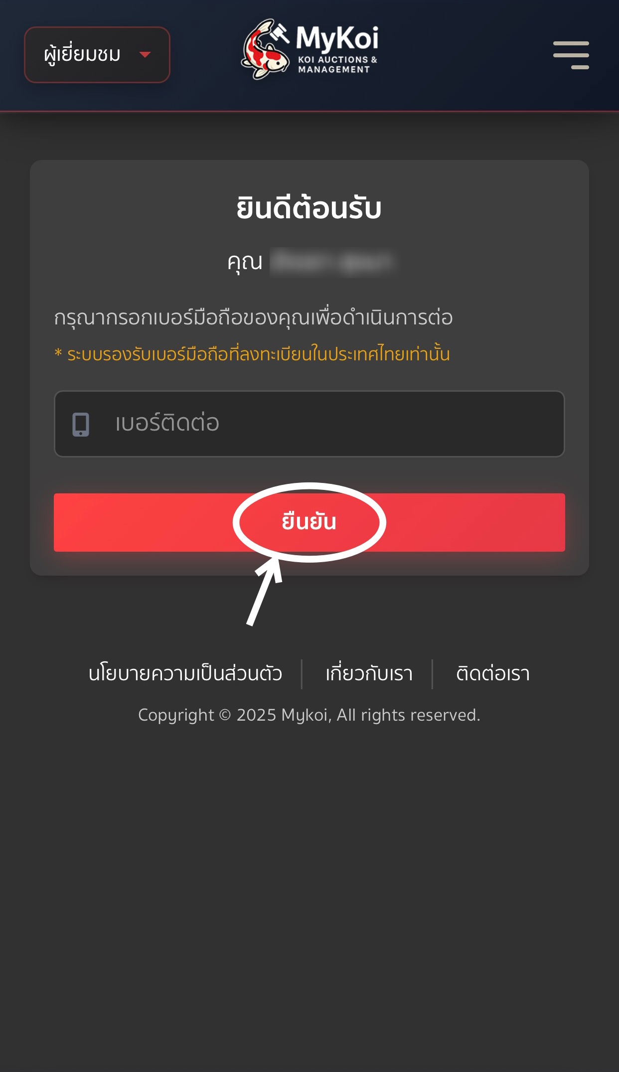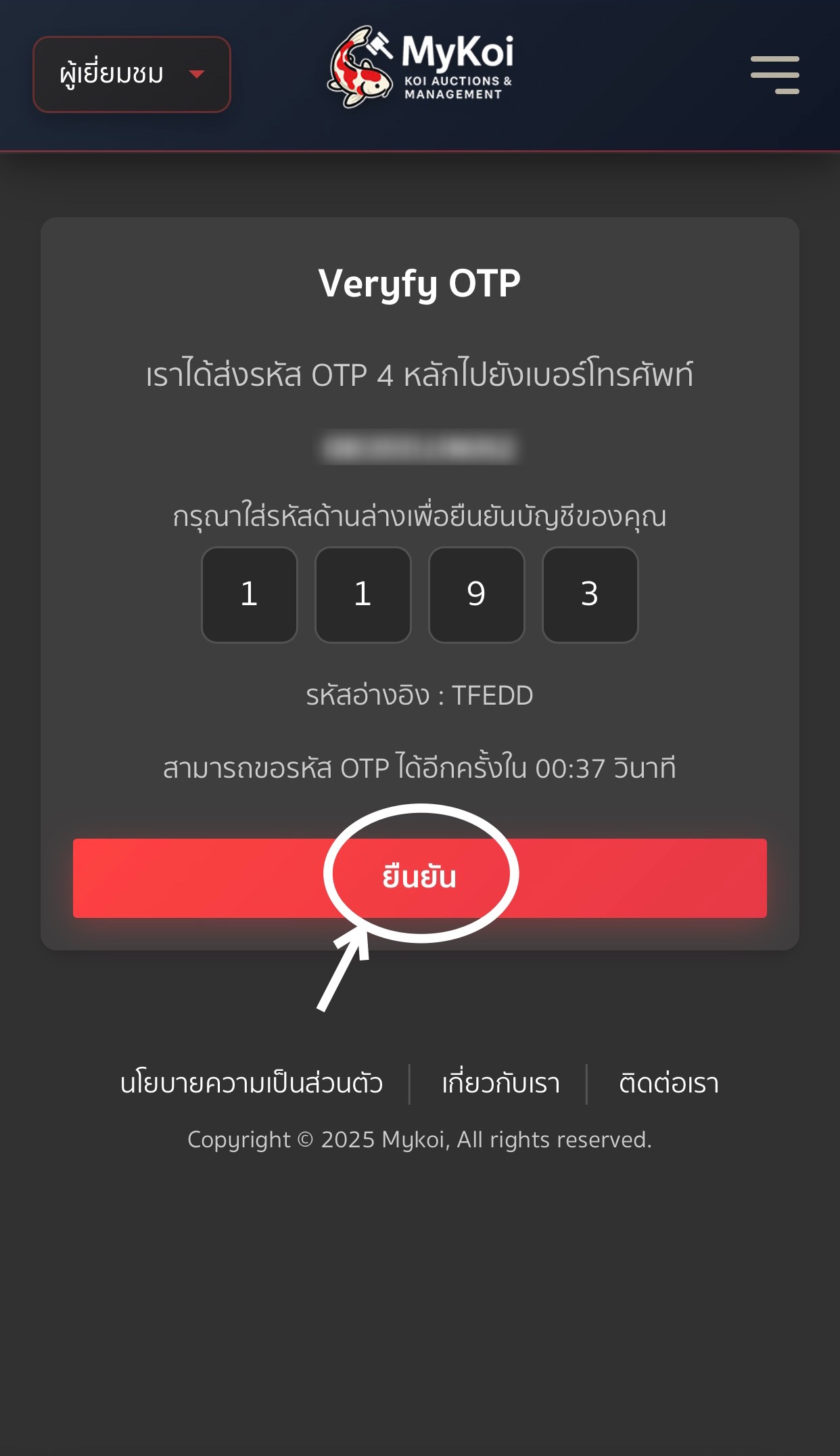 5. จากนั้นกรอกเบอร์มือถือ 10 หลัก กดยืนยัน จะมี SMS ส่งไปยังมือถือของคุณ ใส่รหัส OTP 4 หลัก เพื่อยืนยันบัญชี