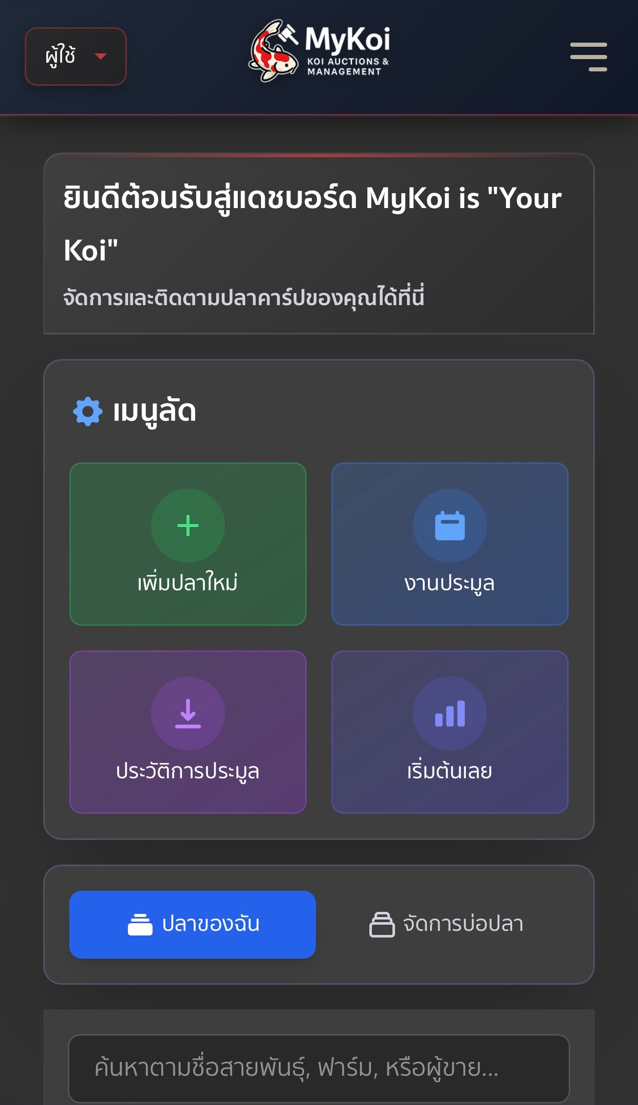 6. ระบบจะพาไปยังหน้าแดชบอร์ด เป็นอันเสร็จสิ้น สามารถใช้งานเว็บไซต์เพื่อจัดการและติดตามปลาคาร์ปของคุณได้เลย