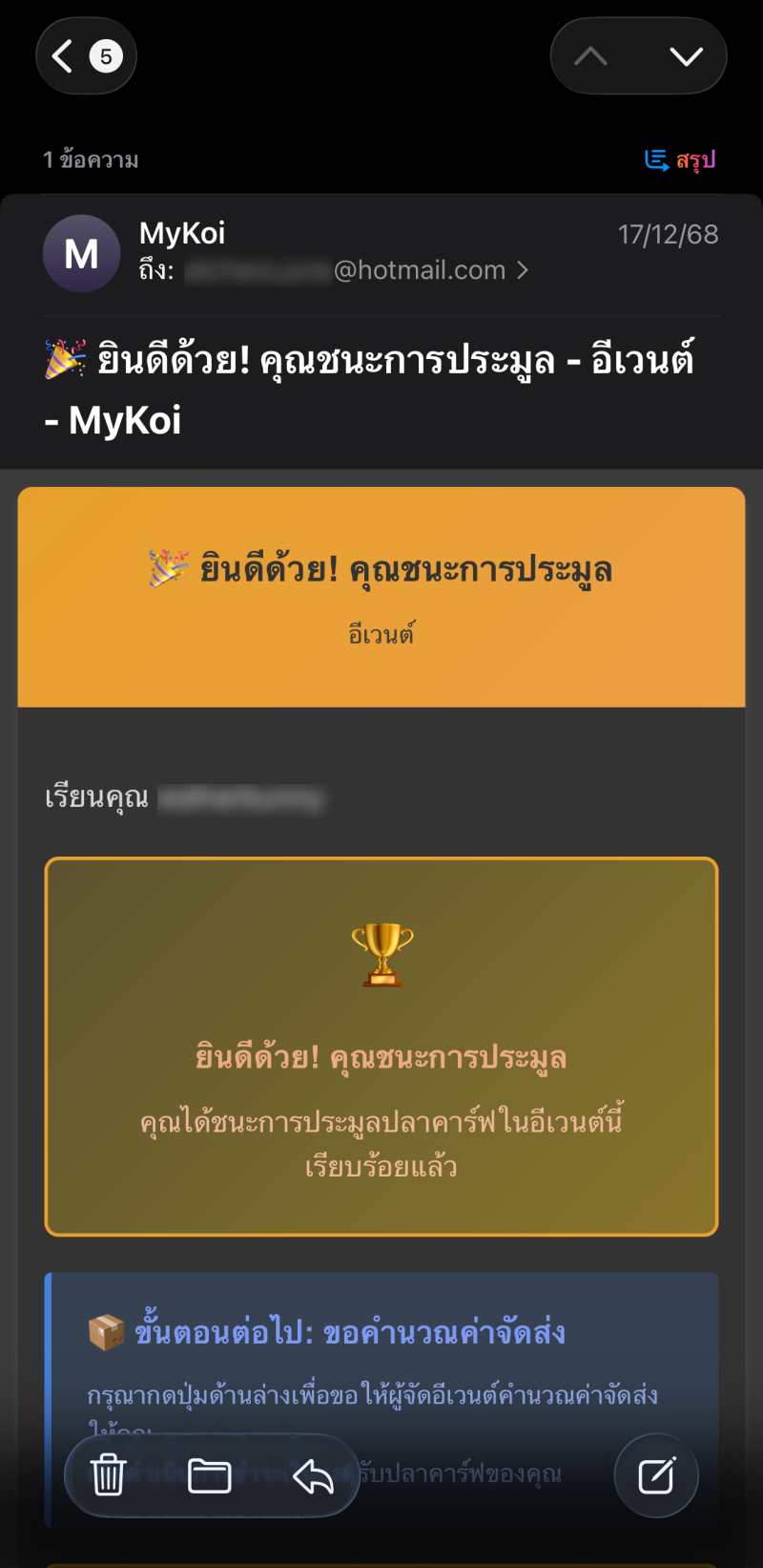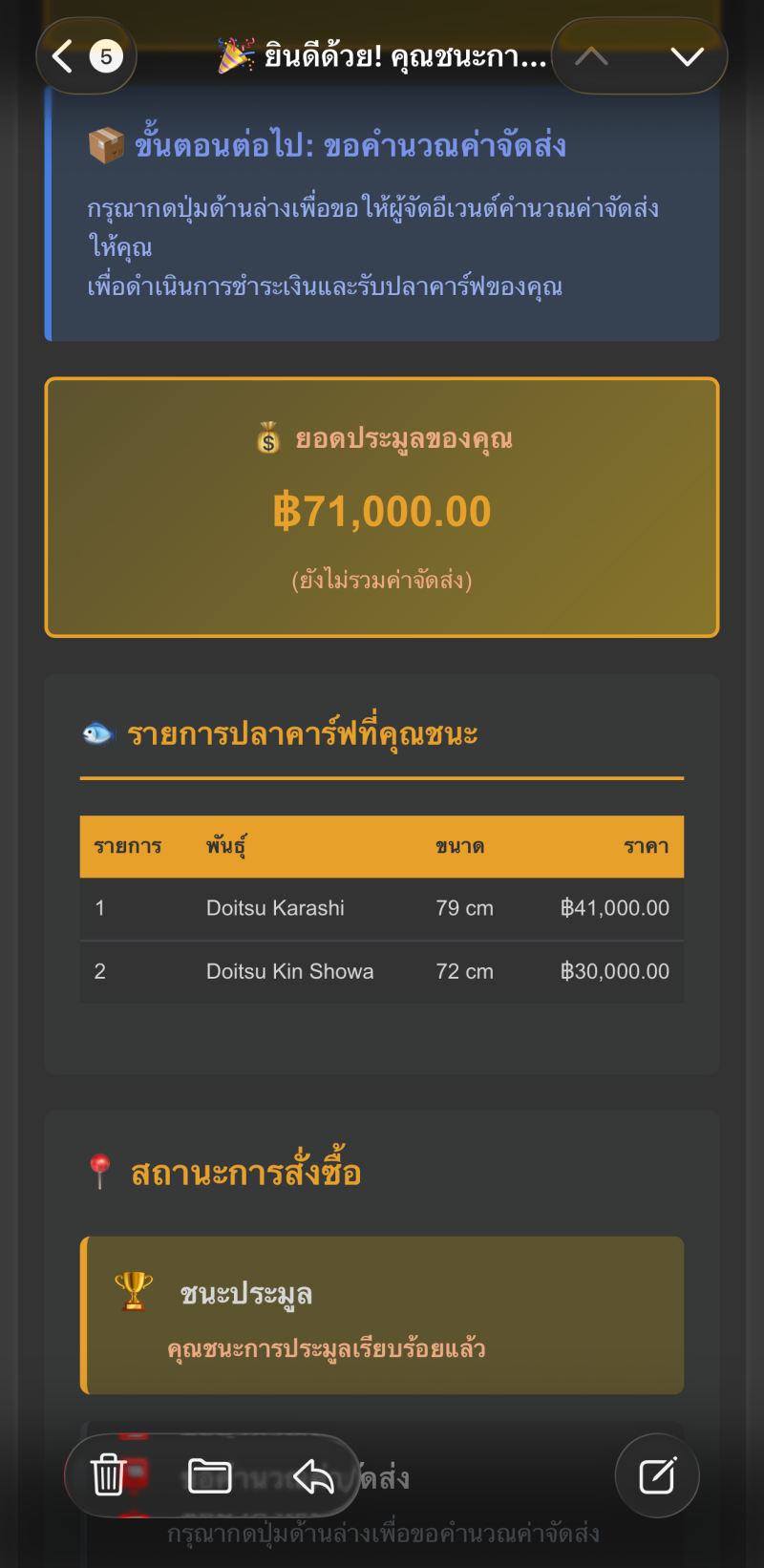 - วิธีที่ 1 : หากคุณเป็นผู้ชนะประมูล จะมีอีเมลแจ้งเตือน โดยที่ระบบจะส่งอีเมลไปยังผู้ชนะประมูล ไม่เกิน 2 ชั่วโมงจากเวลาปิดประมูลของปลาตัวแรกในอีเว้นต์ หลังจาก 2 ชั่วโมงหลังปิดประมูล คุณสามารถเช็คอีเมลได้เลย จะมีอีเมลแจ้งว่า 🎉 ยินดีด้วย! คุณชนะการประมูล - อีเวนต์ - MyKoi ให้เลื่อนลงมาตรวจสอบยอดประมูล รายการปลาที่ชนะ ถ้าถูกต้องแล้ว กดขอคำนวณค่าจัดส่ง แล้วระบบจะพามายังหน้าจัดการรายการประมูล (เมื่อเข้าสู่ระบบไว้แล้ว) หากยังไม่ขึ้นให้เข้าสู่ระบบก่อน จากนั้นกดขอคำนวณค่าส่ง ถ้าผู้ใช้ใช้วิธีที่ 1 ข้ามไปอ่านข้อที่ 5 ได้เลย