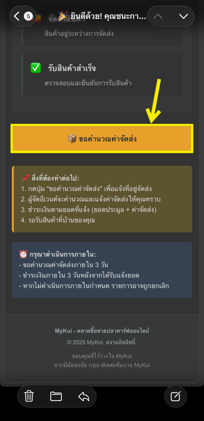 9. จากนั้นรอทางฟาร์มผู้จัดประมูลคำนวนค่าจัดส่ง หากทางผู้ขายกำหนดค่าส่งแล้ว จะมีอีเมลแจ้งให้ดำเนินการชำระเงิน เมื่อรายการพร้อมจะมีปุ่มแจ้งโอนเงิน สำหรับระยะเวลารอการคำนวนค่าจัดส่งภายใน 24 ชั่วโมง หากยังไม่มีปุ่มแจ้งโอนเงินขึ้น ให้ติดต่อแอดมิน LINE: @mykoi ถ้ามีปุ่มแจ้งโอนเงินขึ้นแล้ว ให้กดปุ่มแจ้งโอนเงิน