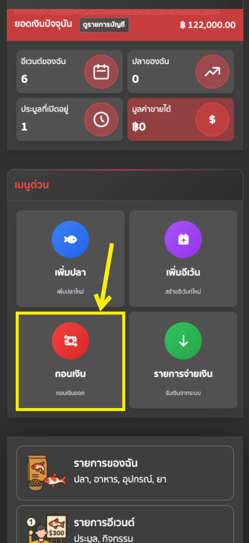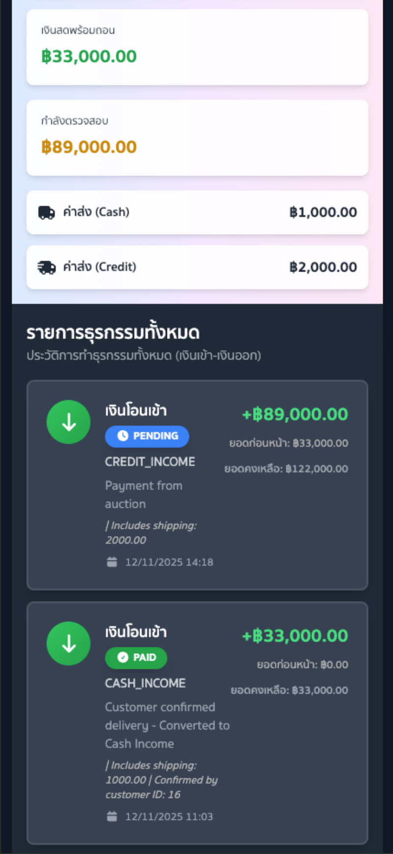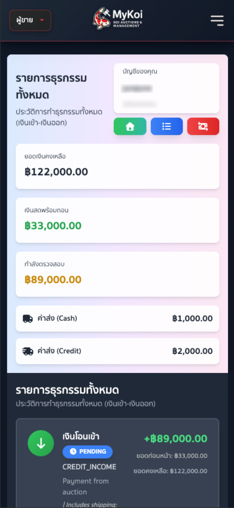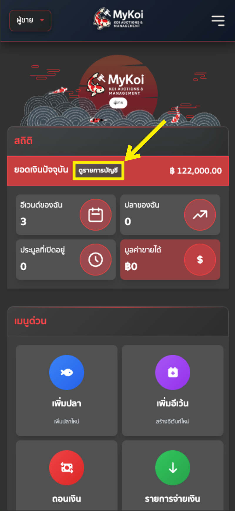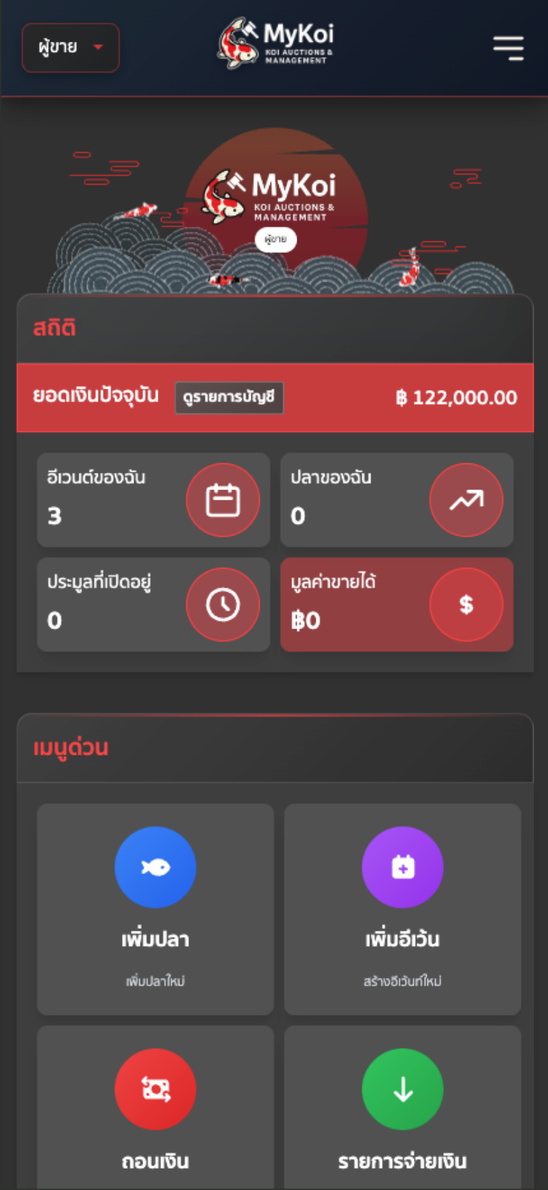 - ยอดเงินคงเหลือ : ยอดเงินทั้งหมดจากอีเวนต์ประมูล (ค่าปลา+ค่าส่ง)