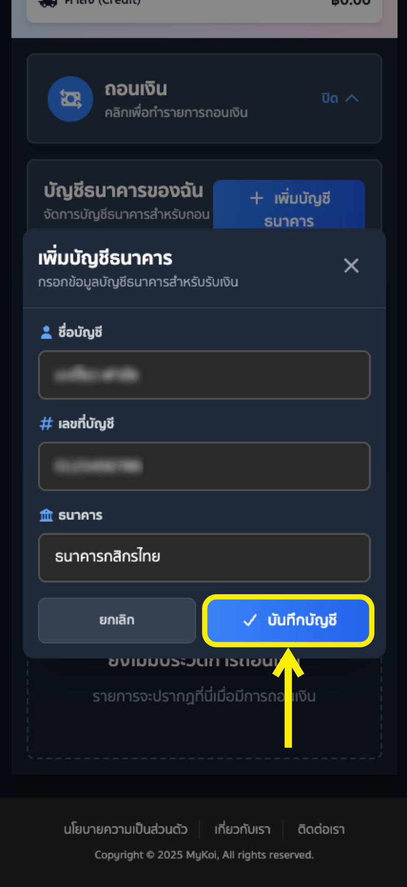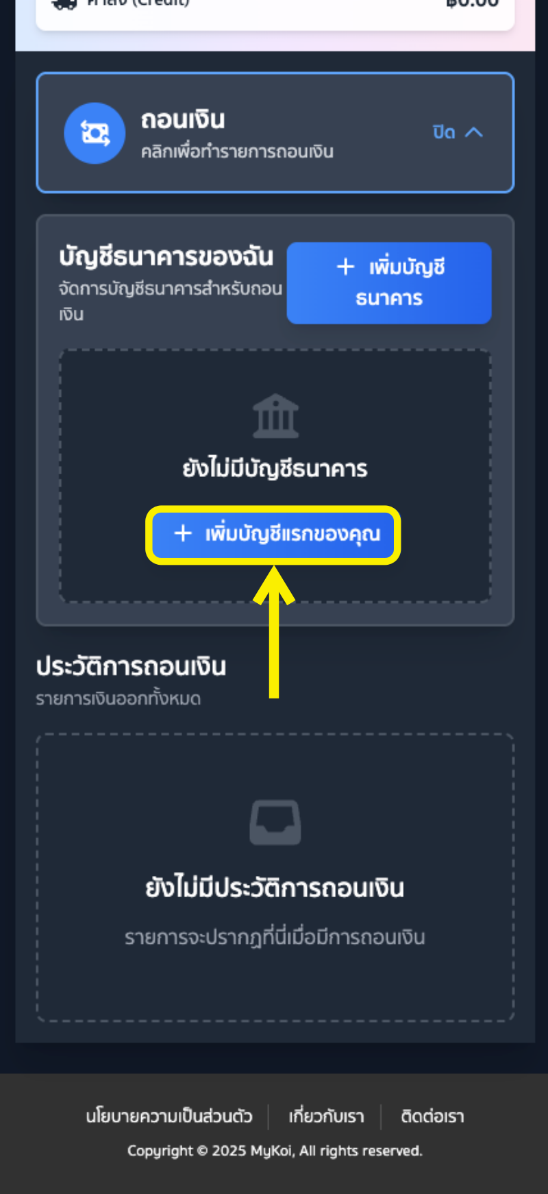 5. สังเกตตรงแถบเมนูถอนเงิน กดเปิด จะขึ้นบัญชีธนาคารของฉัน แล้วกด + เพิ่มบัญชีแรกของคุณ