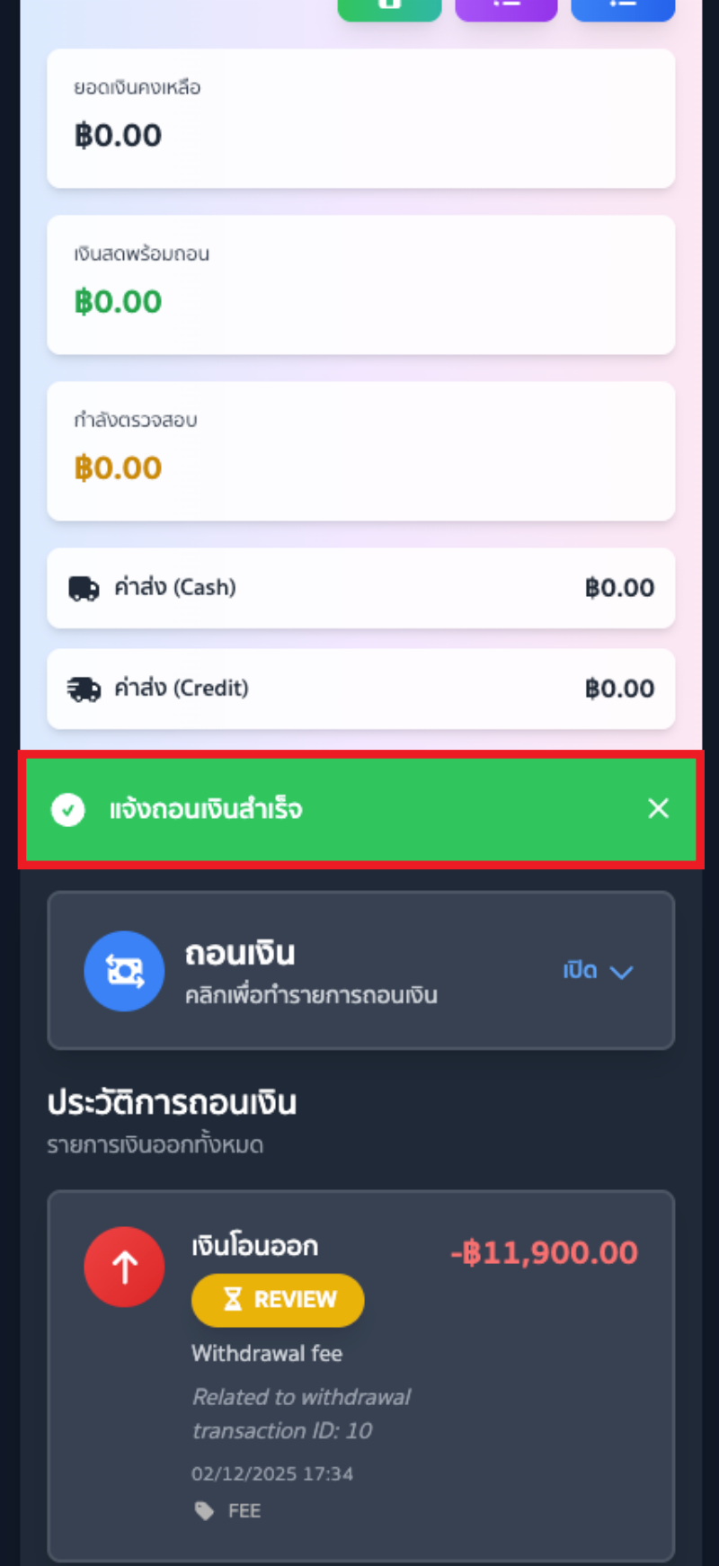 4. หากผู้ขายต้องการถอนเงิน สังเกตที่แทบเมนูด้านล่างบัญชีของคุณ กดที่ปุ่มสีแดงตามลูกศรชี้ ระบบจะขึ้นหน้าถอนเงิน สามารถจัดการการถอนเงินและดูประวัติการทำรายการได้จากหน้านี้เลย แสดงยอดเงินคงเหลือ, เงินสดพร้อมถอน, กำลังตรวจสอบ, ค่าส่ง (Cash) และค่าส่ง (Credit)