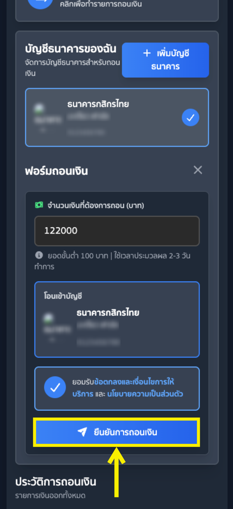 7. จากนั้นกดที่บัญชีที่คุณเพิ่มไว้ตามลูกศรสีเหลือง จะขึ้นฟอร์มถอนเงิน จากรูปมียอดเงินสดพร้อมถอน 122,000 บาท (ค่าปลา+ค่าส่ง) ให้ผู้ขายกรอกจำนวนเงินที่ต้องการถอน แนะนำให้ถอนออกทั้งหมด จากรูปมียอดรวม 122,000 บาท กรอกตรงช่องจำนวนเงินที่ต้องการถอน (บาท) กดยอมรับข้อตกลงและเงื่อนไขการให้บริการและนโยบายความเป็นส่วนตัว แล้วกดยืนยันการถอนเงิน สำหรับการถอนเงินนั้น ต้องมียอดขั้นต่ำ 100 บาท และใช้เวลา 2-3 วันทำการ