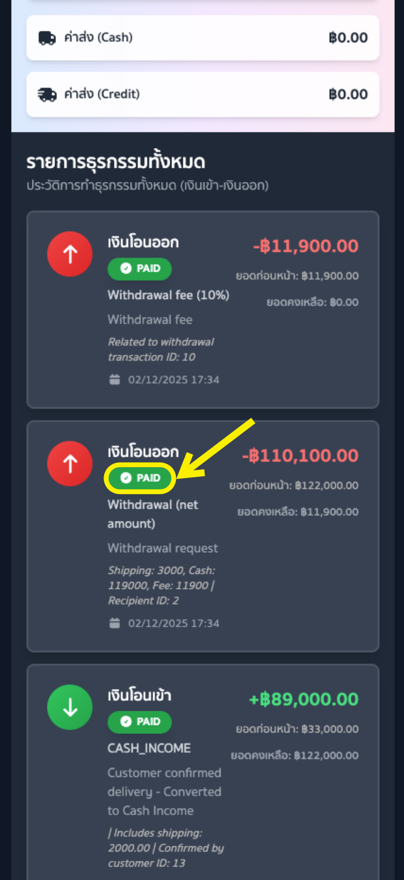3. จะพบกับหน้ารายการธุรกรรมทั้งหมด หน้านี้จะแสดงประวัติการทำธุรกรรมทั้งหมด ยอดเงินคงเหลือ, เงินสดพร้อมถอน, กำลังตรวจสอบ, ค่าส่ง (Cash), ค่าส่ง (Credit), และรายการธุรกรรมทั้งหมด แสดงเงินเข้า-เงินออก