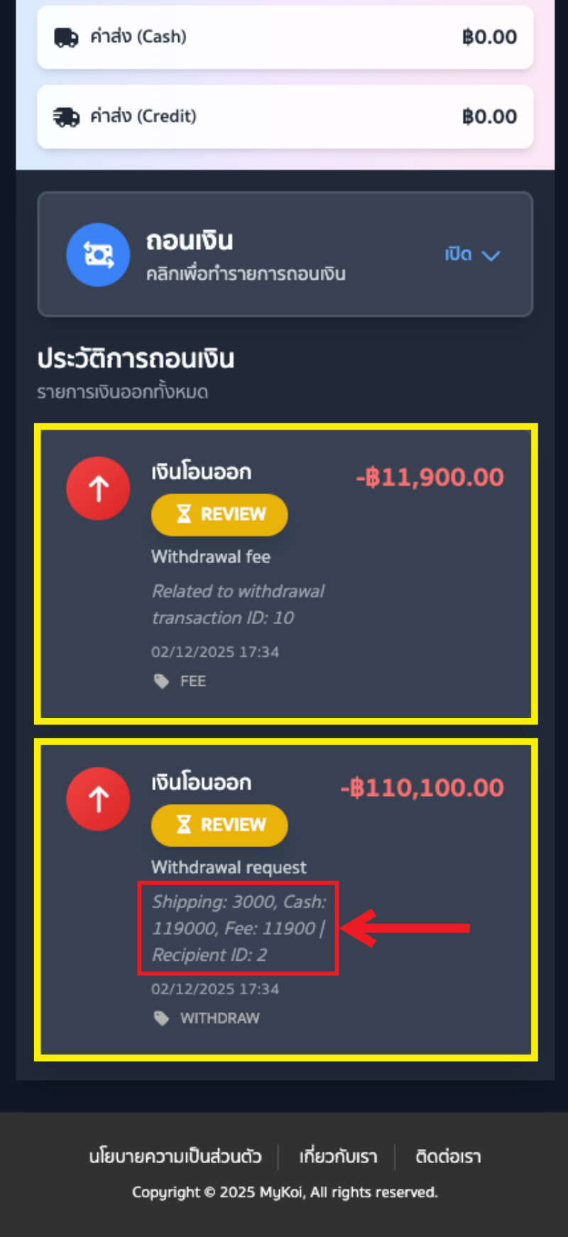 8. หลังจากกดยืนยันการถอนเงินแล้ว ระบบจะขึ้นว่าแจ้งถอนเงินสำเร็จ ยอดเงินสดพร้อมถอนเปลี่ยนเป็น 0 บาท และเมื่อเลื่อนลงมาตรงประวัติการถอนเงิน จะเห็นรายการเงินโอนออก 2 รายการ คือ ยอด 110,100 บาท (จากรูปตรงลูกศรสีแดงชี้ จะมีรายการแจกแจงยอดแสดงอยู่) และยอด 11,900 บาท สำหรับการถอนเงินนั้น ผู้ขายจะถูกหักค่าธรรมเนียมจากเว็บไซต์ 10% จากค่าปลา ส่วนค่าส่งจะไม่มีค่าธรรมเนียม โดยสามารถคำนวณได้ดังนี้