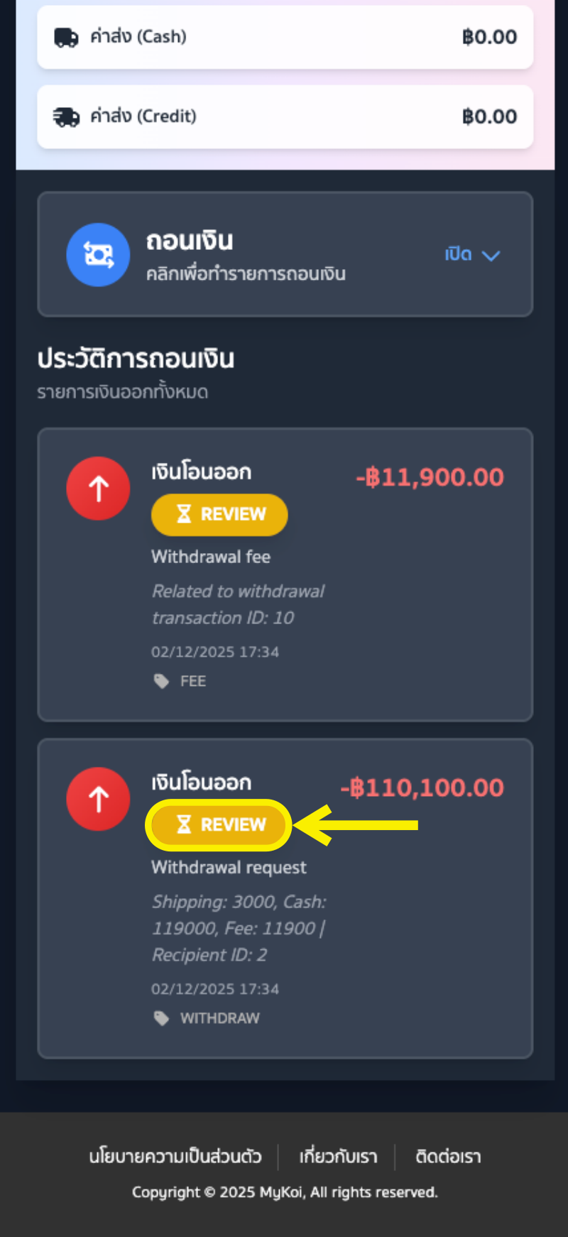 8. สังเกตตรงประวัติการถอนเงิน จะมีสถานะขึ้น คำว่า “REVIEW” หมายความว่า รอเจ้าหน้าที่ดำเนินการ หากเจ้าหน้าที่ทำการโอนเงินให้ผู้ขายแล้ว ระบบจะขึ้นคำว่า “PAID” หมายความว่า โอนเงินให้ผู้ขายเรียบร้อยแล้ว ผู้ขายสามารถเช็คยอดเงินเข้าในแอปธนาคารได้เลย หากพบปัญหาให้แจ้งแอดมิน LINE: @mykoi